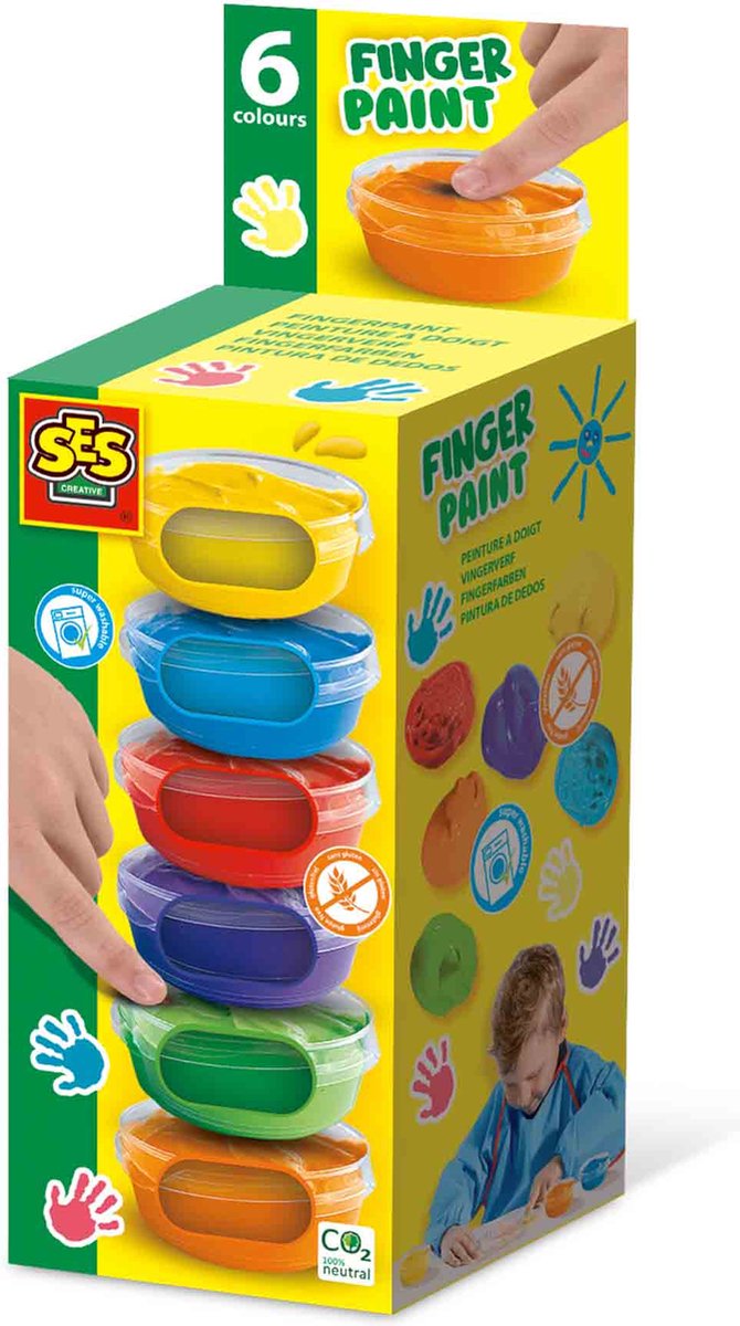 Met deze vingerverf set van SES Creative kunnen jonge kunstenaars zich helemaal uitleven. De set bevat zes heldere kleuren vingerverf die speciaal zijn ontwikkeld voor kleine kinderen. De verf is veilig, glutenvrij, en gemakkelijk uitwasbaar, zodat kleintjes onbezorgd kunnen spelen en experimenteren met kleur.