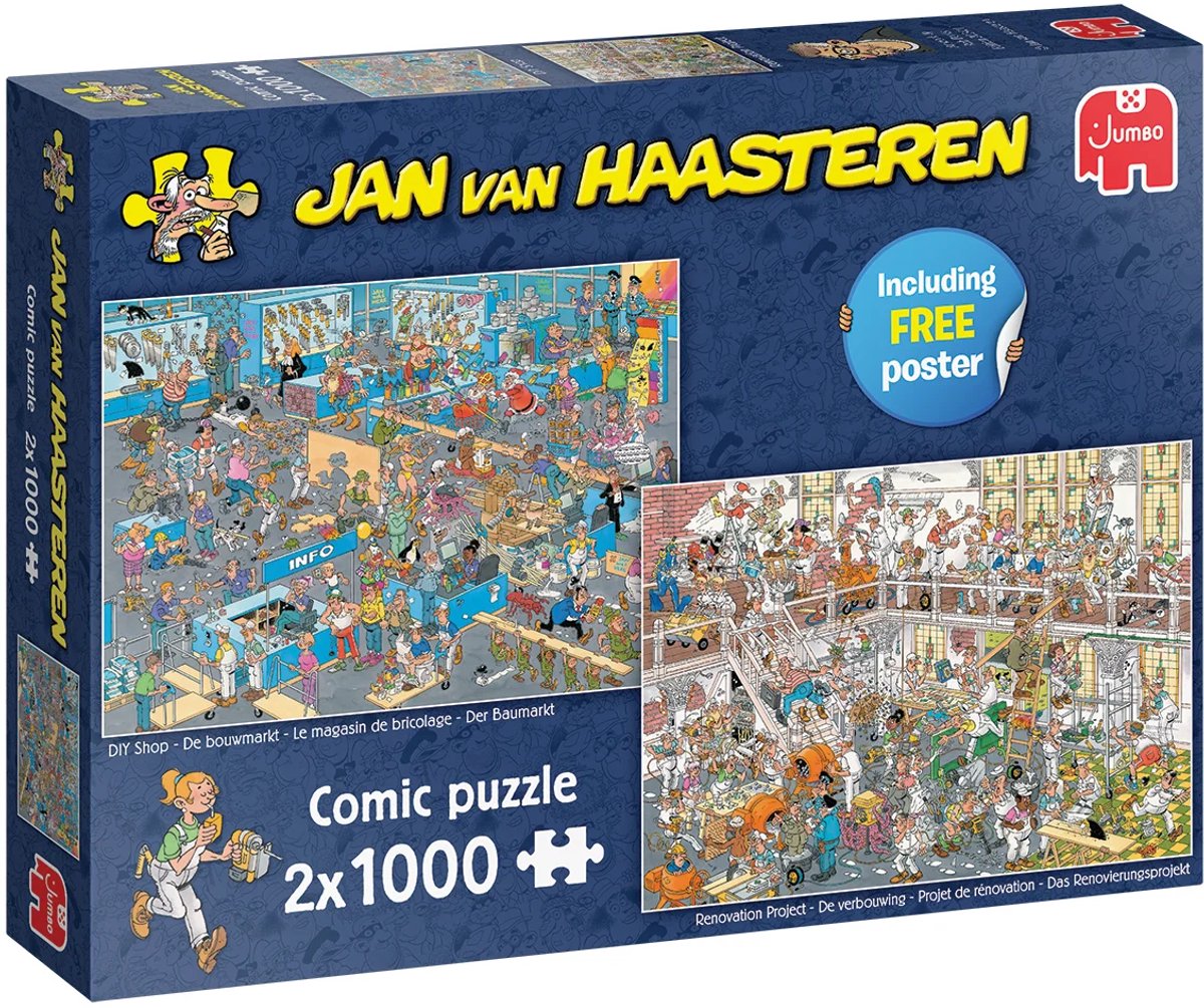 Jan van Haasteren - De Verbouwing & De Bouwmarkt - 2X1000 stukjes puzzel In deze 2 - in - 1 nemen we een kijkje in het klussende leven van de familie Van Haasteren, waar het stof nooit gaat liggen! De bouwmarkt Het is een drukke middag in de bouwmarkt! Voor de grote verbouwing van het pasgetrouwde stel wordt volop materiaal ingeslagen. Gereedschap, verf en hout stapelen zich op bij de kassa. Maar het zijn niet alleen de leden... lees meer over dit product