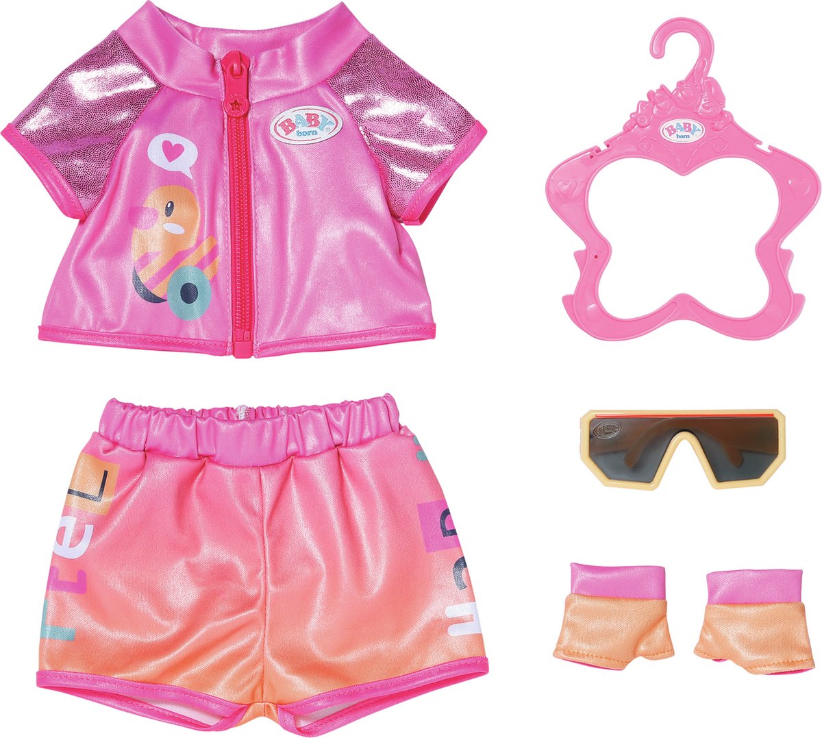 BABY born Fietsoutfit - 43 cmFietsen op een fiets of driewieler is dubbel zo leuk met deze sportieve fietsoutfit! De korte broek en het bijpassende fietsshirt in de kleuren roze en oranje zijn een echte blikvanger en worden perfect aangevuld door de bijpassende handschoenen en zonnebril. BABY born en BABY born Beer zagen er nog nooit zo goed uit tijdens een fietstocht. Sportieve outfit voor fietsers op een driewieler of fiets:... lees meer over dit product