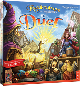 Op het marktplein van Kakelenburg heerst bedrijvigheid. De spelers kruipen in de huid van 2 kwakzalvers, die met veel bombarie en geschreeuw om de aanwezige toeschouwers strijden. Aan beide kanten is uiterste concentratie vereist, want elke actie wordt nauwkeurig door de concurrent geobserveerd. Beide spelers proberen de nog twijfelende patiënten naar hun kraam te lokken, want elke patiënt die een speler behandelt, geeft hem meer aanzien in het gildenhuis van de kwakzalvers. Wie van jullie wordt de volgende gildenmeester van de Kwakzalvers van Kakelenburg? Over het spel Op het marktplein van Kakelenburg heerst bedrijvigheid. De spelers kruipen in de huid van 2 kwakzalvers, die met veel bombarie en geschreeuw om de aanwezige toeschouwers strijden. Aan beide kanten is uiterste concentratie vereist, want elke actie wordt nauwkeurig door de concurrent geobserveerd. Beide spelers proberen de nog twijfelende patiënten naar hun kraam te lokken, want elke patiënt die een speler behandelt, geeft hem meer aanzien in het gildenhuis van de kwakzalvers. Wie van jullie wordt de volgende gildenmeester van de Kwakzalvers van Kakelenburg? Wie speelt er De Kwakzalvers van Kakelenburg: Het Duel? Deze versie van het bekende bordspel “De Kwakzalvers van Kakelenburg” is uitsluitend geschikt voor 2 spelers, maar biedt meer interactie en onderlinge strijd dan het basisspel. Wie dus houdt van het beproeven van zijn geluk, het dwarszitten van zijn tegenstander en het uitproberen van verschillende tactieken, komt in dit spel helemaal aan zijn trekken. Hoe speel je De Kwakzalvers van Kakelenburg: Het Duel? De spelers proberen patiënten uit het park naar hun marktkraam te lokken. Beiden hebben een fles, waarin plaats voor verschillende fiches is, en een buidel met fiches. Ben je aan de beurt, dan trek je fiches totdat je vrijwillig stopt of je fles ontploft. Afhankelijk van het resultaat mag je de patiënt of zelfs je marktkraam verplaatsen. Bereikt de patiënt je marktkraam, dan mag je die behandelen en vertrekt de volgende patiënt. Na het voltooien van hun drank mogen de spelers nieuwe fiches kopen. Elk fiche heeft bepaalde eigenschappen, die dan wel direct, dan wel later in een ronde worden geactiveerd. Heeft een speler zijn zesde patiënt behandeld, dan heeft hij direct gewonnen. Het spel eindigt ook na ronde 7. Dan wint de speler die de meeste patiënten heeft behandeld.