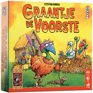 Vlot blufspel voor het hele gezin! Het pluimvee op de boerderij houdt een groot buffet. De vossen uit de omgeving eten ook graag mee, maar die hebben duidelijk een ander beeld van de samenstelling van het menu. Speel pluimveekaarten om graankorrels te verzamelen en vossenkaarten om juist pluimvee te verschalken. De locaties waar je de kaarten naartoe stuurt, bepalen wie er met de buit vandoor gaat. Over het spel In dit vlotte blufspel kunnen kippen, ganzen en ander pluimvee die op het juiste moment op de voederbak afgaan een graantje meepikken. Hetzelfde geldt echter voor de vossen, maar die willen liever het pluimvee verschalken… Wie speelt er De Graantje de Voorste? Graantje de Voorste is vooral geschikt voor spelers die van bluf en onverwachte wendingen houden. Omdat ze elke ronde tegelijkertijd een gedekte kaart spelen, moeten ze proberen om in te schatten wat de andere spelers doen. Dat kan leiden tot makkelijk voedsel vinden, maar ook tot het verdelen ervan of zelfs het vechten erom. Dit blufspelletje is eenvoudig te leren en dus leuk voor het hele gezin! Hoe speel je Graantje de Voorste? Elke ronde worden zes hokken met graan gevuld. Iedere speler kiest dan een kaart uit zijn hand en legt die gedekt voor zich neer. De kleur van de kaart bepaalt naar welk hok het pluimvee of de vos gaat. Het getal op de kaart geeft de puntenwaarde van het dier aan. Die is van belang als meerdere vogels naar hetzelfde hok gaan of als een vos zo'n beest te pakken krijgt. Een vogel die in zijn eentje naar een hok gaat, pikt alle graankorrels weg. Bij meerdere vogels kunnen ze de boel met elkaar delen, maar als er eentje is die dat verdelen maar niks vindt, gooien ze allemaal met een dobbelsteen en tellen ze het resultaat bij hun puntenwaarde op. Wie het hoogste resultaat heeft, mag alle graankorrels hebben. Een vos die in zijn eentje naar een hok gaat, krijgt niets (hij lust geen graan),maar is er pluimvee aanwezig, dan eet hij dat allemaal op. Gaan er meerdere vossen naar hetzelfde hok, dan moeten ze dobbelen. Vossen zijn namelijk egoïstische dieren en delen uit principe niets! Zijn de laatste graankorrels in de hokken gestrooid, dan begint de laatste ronde. Wie uiteindelijk de meeste punten met zijn verzamelde graankorrels en pluimveekaarten heeft binnengehaald, is de winnaar.