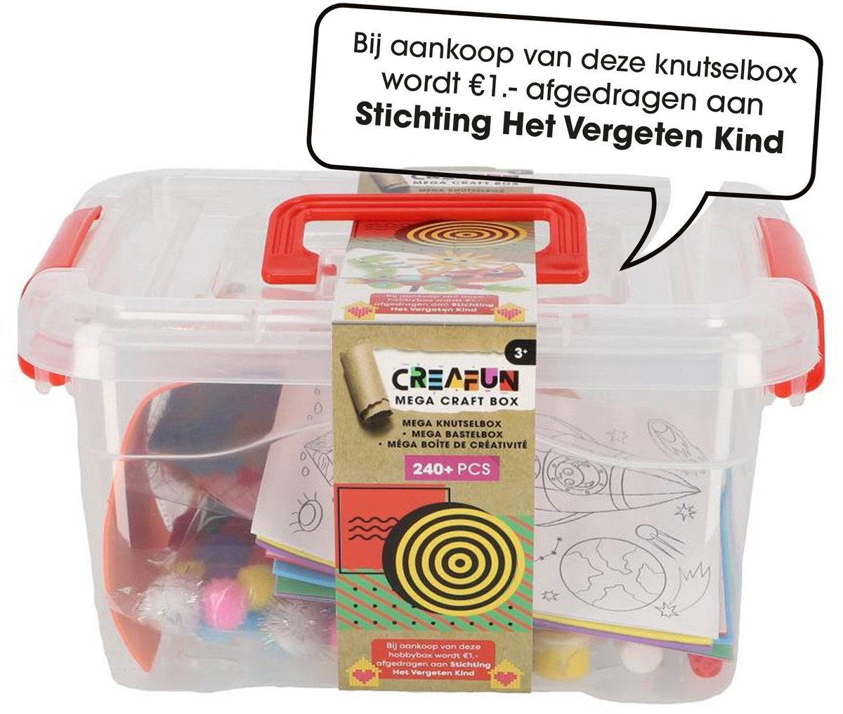 De Creafun Mega Knutselbox is de ideale set voor creatieve zielen die op zoek zijn naar een uitgebreide verzameling materialen om hun fantasie de vrije loop te laten. Met maar liefst 240 onderdelen biedt deze knutselbox alles wat je nodig hebt voor talloze knutsel\\n -en hobbyprojecten. Het compacte formaat van 24x18x12 cm maakt het gemakkelijk om de box op te bergen en mee te nemen, waardoor je altijd en overal kunt knutselen... lees meer over dit product