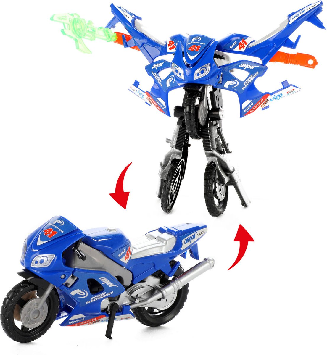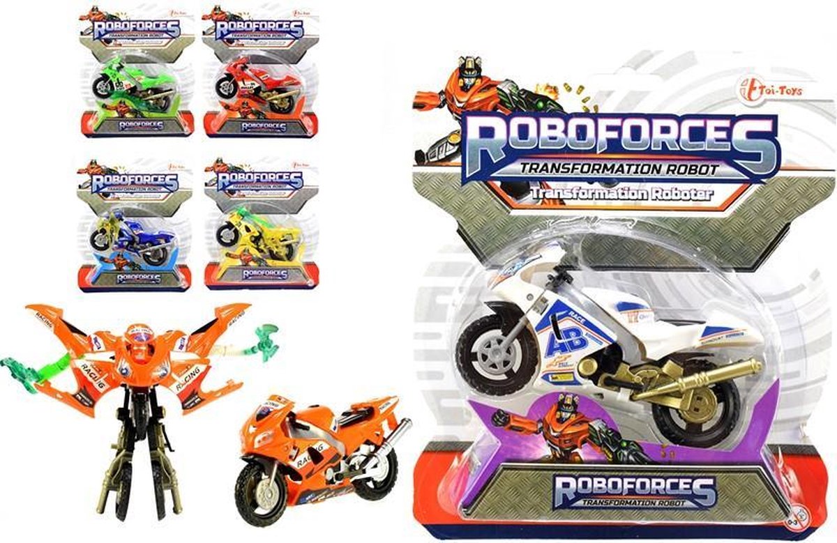 Deze ROBOFORCES motor ziet er heel snel uit en dat is hij natuurlijk ook. Maar hij heeft nóg een extra verrassing. Met een paar handelingen verander je hem zomaar in een stoere robot. Er zijn 6 verschillende kleuren beschikbaar. U krijgt een willekeurige kleur opgestuurd