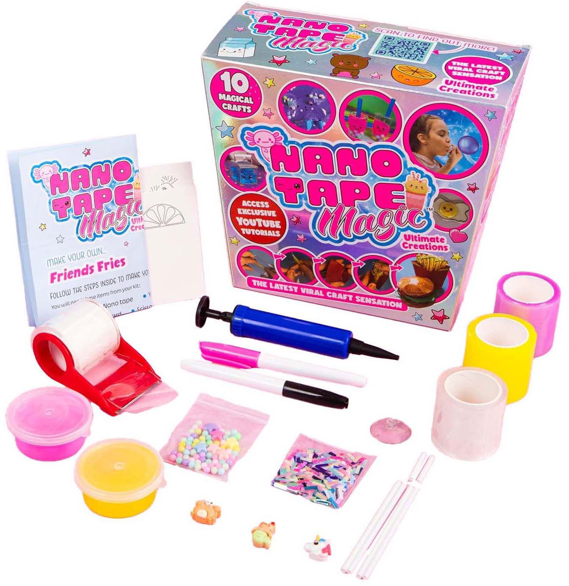 Het is tijd voor magie met Nano Tape Magic! Probeer nu zelf de virale knutseltrend! Deze leuke en extra grote Ultimate Creations knutselset bevat alles wat je nodig hebt om maar liefst 10 superleuke nano tape creaties te maken. Maak je eigen magische ontwerpen van onder andere: Franse Friends Fries, een Axolotl dier, een schattige Bubbel Beer, een oranje Fruity Squishy en een Emoji kubus.