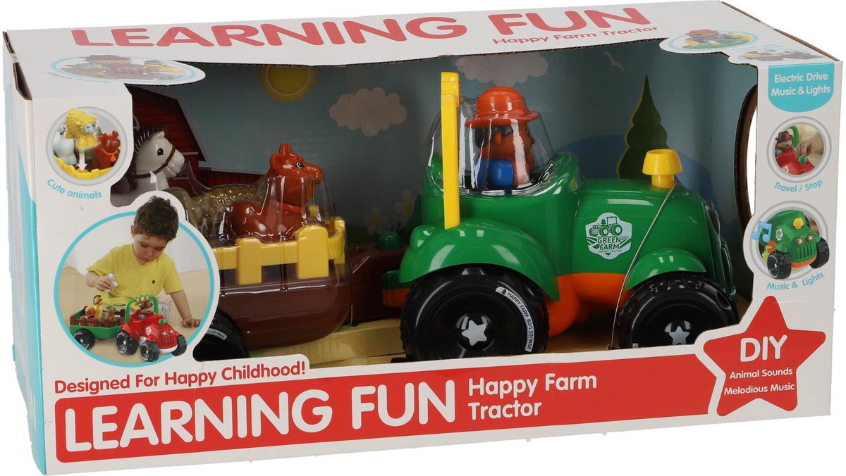 KiddyGo tractor speelgoed met dieren en licht en geluid aanhangerMet deze vrolijke tractor van KiddyGo beleef je eindeloos speelplezier! De tractor met dieren op de aanhanger zorgt voor een echte boerderij-ervaring in huis. Dankzij de licht- en geluidseffecten wordt het spelen nog leuker en levensechter.De stevige tractor is gemaakt van kunststof en is perfect voor kleine handjes. Zet de dieren op de aanhanger en rijd ze rond door de kamer of tuin. Geschikt voor kinderen vanaf 3 jaar, dus ideaal voor jonge ontdekkers die dol zijn op voertuigen en dieren.Extra informatieVoorzien van licht- en geluidseffectenInclusief dieren op de aanhangerGemaakt van stevig kunststofGeschikt voor kinderen vanaf 3 jaar.