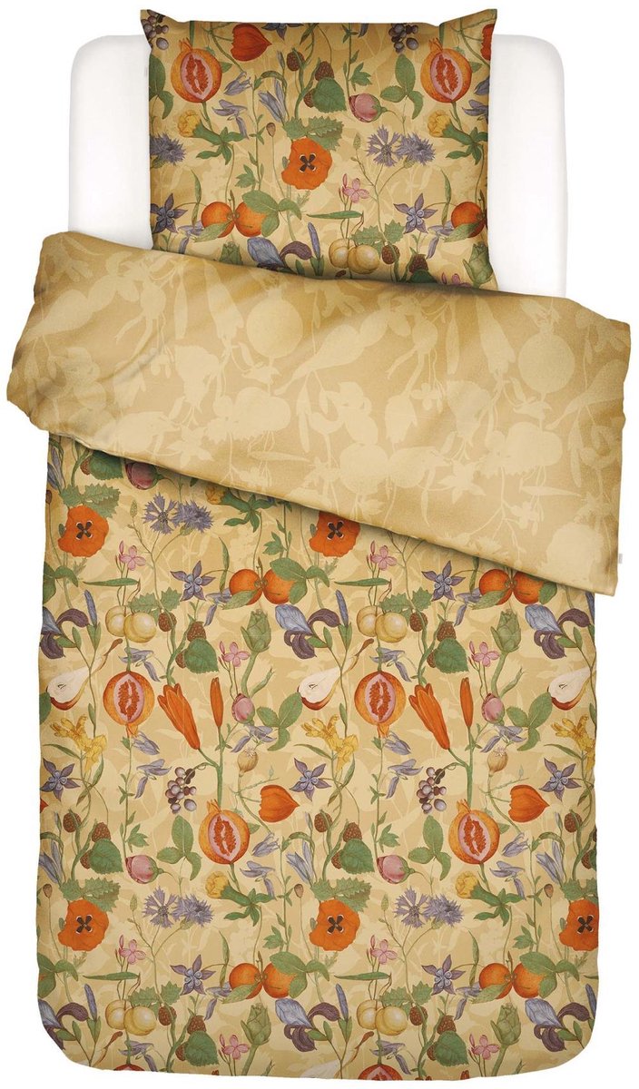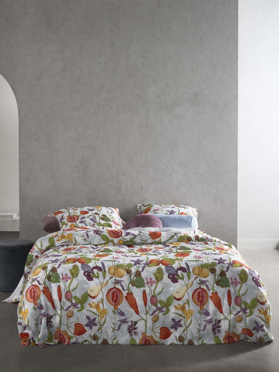 Print Phaedra is een collage van verschillende onderdelen uit het Rijksmuseum en daar hebben onze ontwerpers een geheel eigen compositie van gemaakt. Het dekbedovertrek is bezaaid met klaprozen, peren, bramen, sinaasappels, druiven en granaatappeltjes. Dit kleurrijke en fruitige geheel springt er tegen de lichtgele achtergrond heerlijk fris uit. De andere kant bestaat uit een schaduwprint van de voorzijde, waardoor je het dekbedovertrek ook kan omdraaien voor een ander gevoel in je slaapkamer.