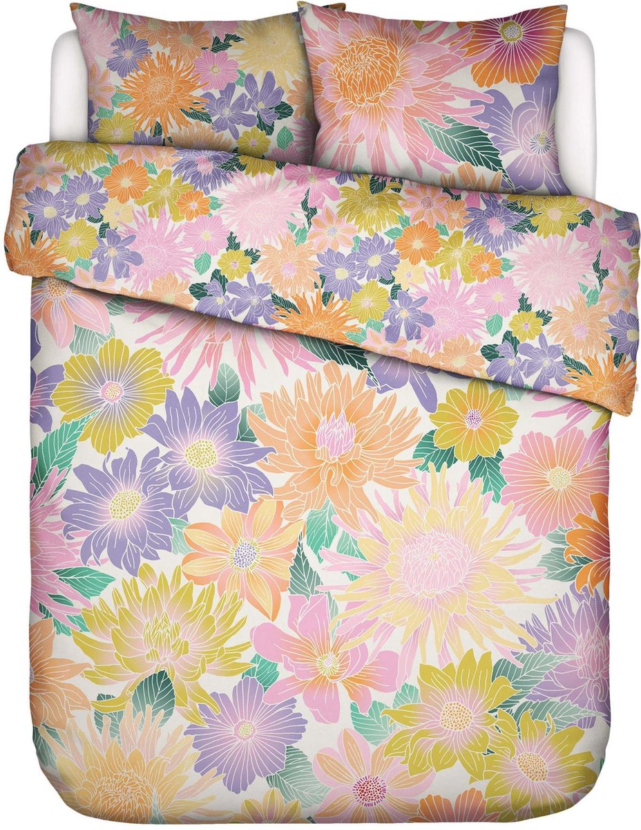 Een multicolour print met grote handgetekende dahlia’s in verschillende zachte tinten paars, oranje, geel, roze en groen. De blaadjes van de bloemen bevatten een subtiel kleurverloop. De andere zijde toont dezelfde bloemen in een verkleinde versie wat zorgt voor een speels effect wanneer je het dekbedovertrek omslaat. Dit dekbedovertrek is gemaakt van 100% GOTS-gecertificeerd biologisch katoen perkal, een luxe stof met een cri... lees meer over dit product
