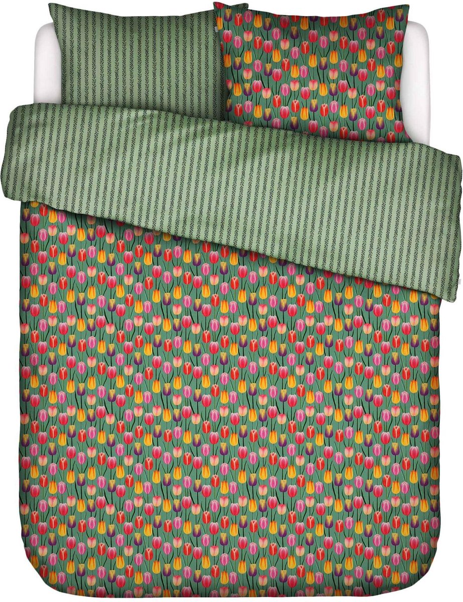 Dit dekbedovertrek van ESSENZA & CO brengt een vrolijke sfeer in je slaapkamer. Aan de ene kant is het dekbedovertrek versierd met een kleurrijk patroon van tulpen in rood, geel, oranje en roze op een frisgroene achtergrond. Deze kant straalt energie en vreugde uit, perfect voor iedereen die een frisse en opgewekte uitstraling wil in hun slaapkamer. De andere kant van het dekbedovertrek biedt een rustgevend contrast met een su... lees meer over dit product