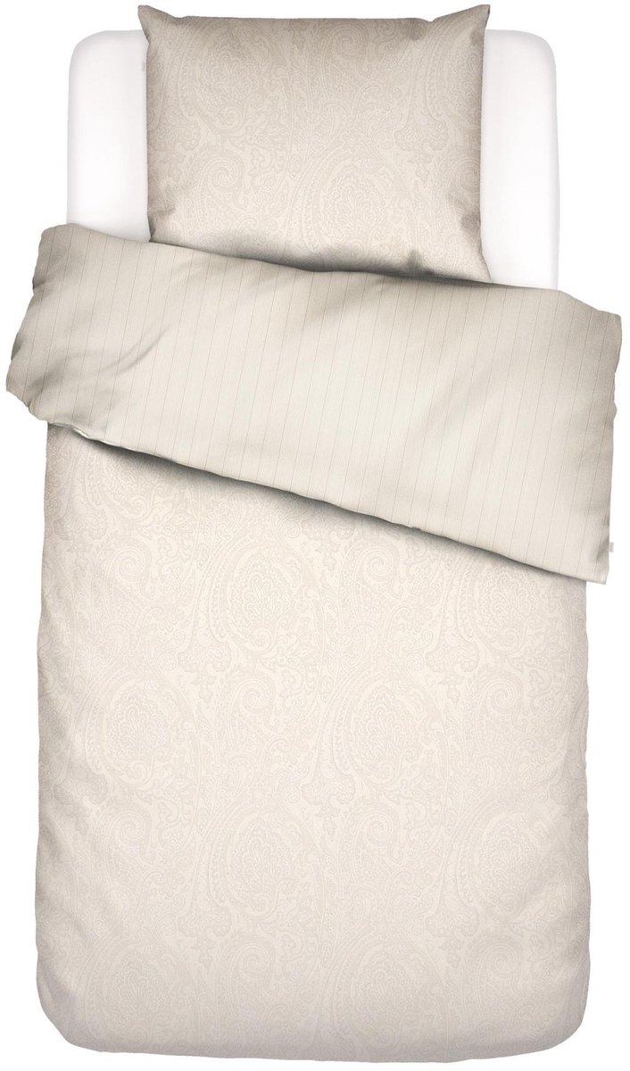 Dekbedovertrek Fabrice toont de verfijnde paisley print, een geliefd ESSENZA dessin uit het archief. De elegante, gebogen, abstracte vormen herhalen zich in een symmetrisch patroon die mooi afsteken tegen de lichte ondergrondkleur. Over de print zit een subtiele zilveren parelmoerprint voor een lichte glans, vergelijkbaar met het binnenste van een schelp. Op de achterkant van het dekbedovertrek is een fijn streepje gebruikt in dezelfde kleurtinten. Een dekbedovertrek voor een chique slaapkamersfeer met een elegante uitstraling. Het ESSENZA dekbedovertrek, gemaakt van 100% katoen, is ademend en absorbeert vocht. Katoensatijn is zonder twijfel onze favoriete stof voor beddengoed. Bovendien voelt een dekbedovertrek van katoensatijn zachter en gladder dan normaal katoen door zijn speciale satijnweefsel, wat de stof een zachte glans geeft.