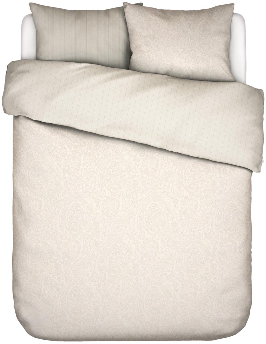 Dekbedovertrek Fabrice toont de verfijnde paisley print, een geliefd ESSENZA dessin uit het archief. De elegante, gebogen, abstracte vormen herhalen zich in een symmetrisch patroon die mooi afsteken tegen de lichte ondergrondkleur. Over de print zit een subtiele zilveren parelmoerprint voor een lichte glans, vergelijkbaar met het binnenste van een schelp. Op de achterkant van het dekbedovertrek is een fijn streepje gebruikt in dezelfde kleurtinten. Een dekbedovertrek voor een chique slaapkamersfeer met een elegante uitstraling. Het ESSENZA dekbedovertrek, gemaakt van 100% katoen, is ademend en absorbeert vocht. Katoensatijn is zonder twijfel onze favoriete stof voor beddengoed. Bovendien voelt een dekbedovertrek van katoensatijn zachter en gladder dan normaal katoen door zijn speciale satijnweefsel, wat de stof een zachte glans geeft.