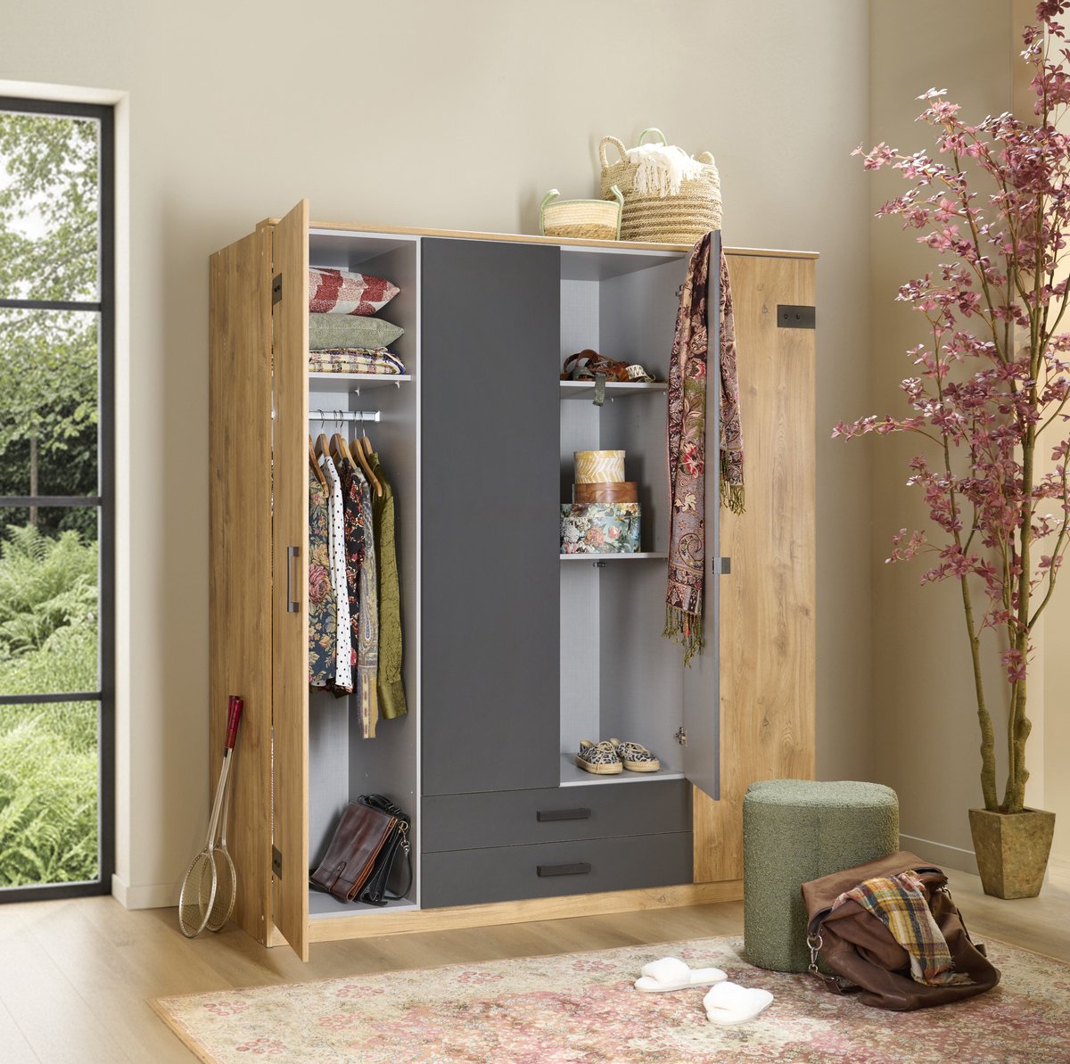 Op zoek naar een ruime kledingkast met een stoere uitstraling? Zoek niet verder, want kast Stratum heeft alles wat je nodig hebt. Deze kast is 180 cm breed en heeft 4 deuren en 2 handige laden. Het decor combineert een robuuste houtlook met grafiet. De metalen grepen zijn ook grafietkleurig en de deuren hebben een stoer accent met stalen popnagels. Met deze uitstraling zal draaideurkast Stratum zeker de aandacht trekken in jouw interieur!