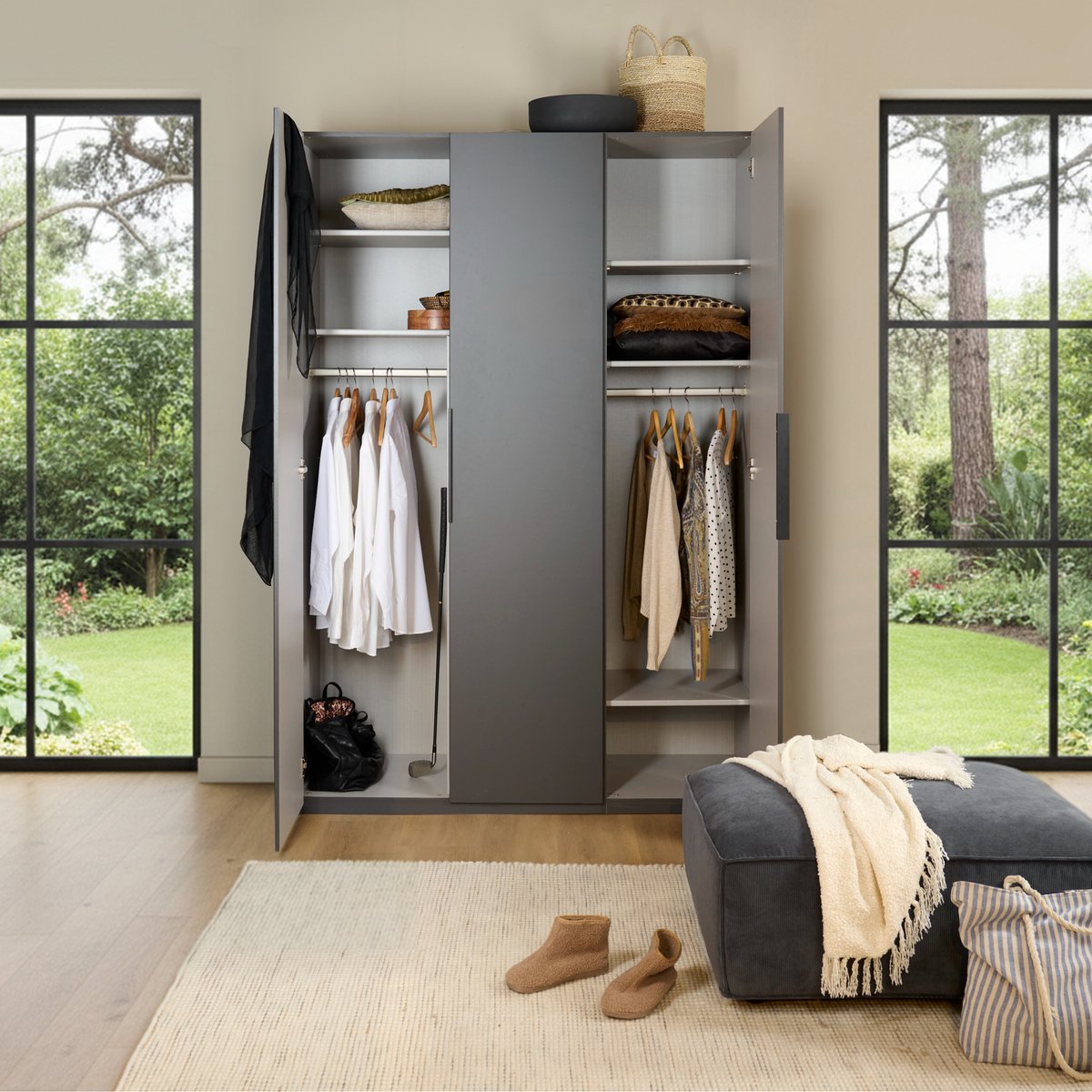 Kledingkast Oss Grijs - 150x216x58 cm De Kledingkast Oss is een essentieel meubelstuk voor elke slaap- of kleedkamer. In plaats van rommelige kleding en linnengoed, biedt deze stijlvolle opberger voldoende ruimte om alles netjes op te bergen. De kledingkast heeft een strak en elegant ontwerp met 3 donkergrijze deuren en opvallende zwarte handgrepen. De Oss variant past perfect in elke luxe slaapkamer of eigentijdse tienerkamer... lees meer over dit product