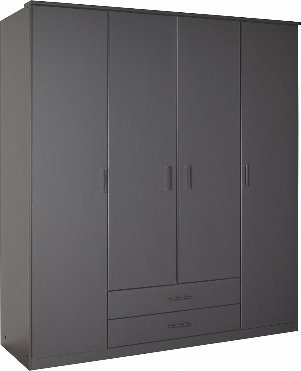 Woonexpress Kledingkast Stolpen Deze draaideurkast heeft een moderne look. Deze antracietgrijze kast is een echte eyecatcher! Indeling: Kledingkast Stolpen wordt met een compleet interieur geleverd. In het midden heeft de kast een breed kastelement met dubbele deuren. In dit brede gedeelte zitten standaard 2 planken. Onderin zitten 2 brede lades. Aan beide kanten van het brede element zit een smal kastelement. Beide smalle e... lees meer over dit product