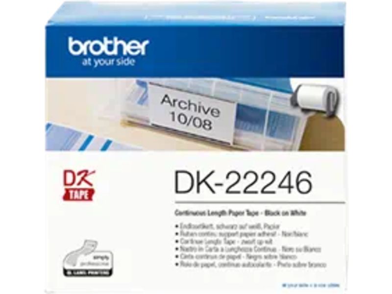 Met de originele Brother DK-22246 doorlopende etikettenrol maak naar behoefte een willekeurig groot, zelfklevende papieren etiketten met zwarte letters op een witte achtergrond. De variant is... lees meer over dit product