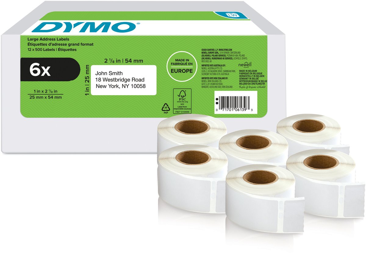- Authentieke grote DYMO-adreslabels voor retouren bieden een duidelijke, leesbare tekst voor een correcte bezorging van pakketten