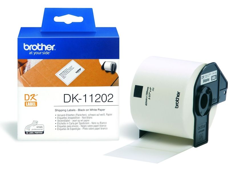 De Brother DK-11202 zijn witte, zelfklevende verzendetiketten, gemaakt van papier. De etiketten zijn 62x100mm, er zitten 300 etiketten op één rol. Deze rol is geschikt voor diverse apparaten uit de Brother QL-serie. lees meer over dit product