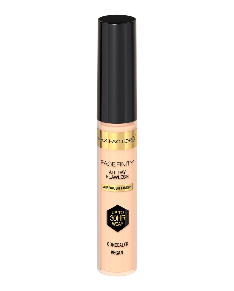 Of je nu op zoek bent naar een concealer die donkere kringen camoufleert, hardnekkige oneffenheden vervaagt of een oneffen teint egaliseert, de Facefinity All Day Flawless Concealer doet het allemaal en blijft bovendien tot wel 30 uur zitten. De zuurstofdoorlatende, lichte concealer is een vegan formule die poriën en roodheid vervaagt, oneffenheden camoufleert en een medium tot hoogdekkend resultaat biedt dat makkelijk te vervagen is. De waterproof formule heeft een soft-focus matte finish voor perfect egale resultaten en is bestand tegen alle weersomstandigheden, hitte, vocht en zweet. Vind jouw perfecte match tussen de 8 tinten van de Max Factor concealer, die bovendien ook antioxiderende eigenschappen heeft én de huid beschermt tegen blauw licht.