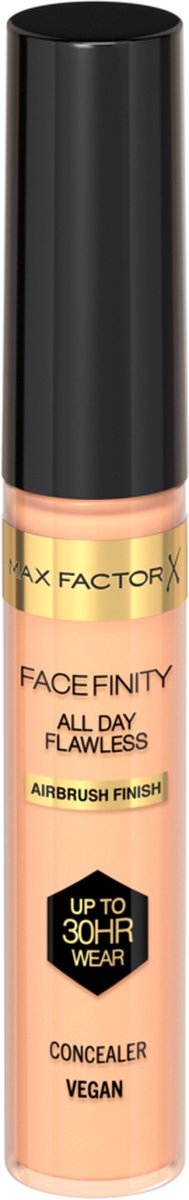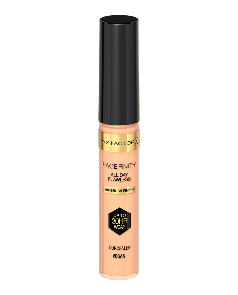 Of je nu op zoek bent naar een concealer die donkere kringen camoufleert, hardnekkige oneffenheden vervaagt of een oneffen teint egaliseert, de Facefinity All Day Flawless Concealer doet het allemaal en blijft bovendien tot wel 30 uur zitten. De zuurstofdoorlatende, lichte concealer is een vegan formule die poriën en roodheid vervaagt, oneffenheden camoufleert en een medium tot hoogdekkend resultaat biedt dat makkelijk te vervagen is. De waterproof formule heeft een soft-focus matte finish voor perfect egale resultaten en is bestand tegen alle weersomstandigheden, hitte, vocht en zweet. Vind jouw perfecte match tussen de 8 tinten van de Max Factor concealer, die bovendien ook antioxiderende eigenschappen heeft én de huid beschermt tegen blauw licht.