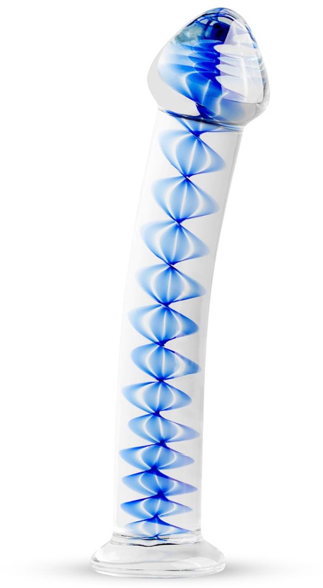 Deze dildo is gemaakt van glas. Het glas is transparant en heeft een blauwe spiraal in het midden voor een unieke look. Glas is een sterk, hygiënisch materiaal dat erg glad aanvoelt. Daarnaast kan het gebruikt worden met elk glijmiddel. De dildo heeft een platte voet en is daardoor veilig te gebruiken voor anale penetratie. De licht gebogen schacht maakt het mogelijk om de G-spot en P-spot te stimuleren. lees meer over dit product