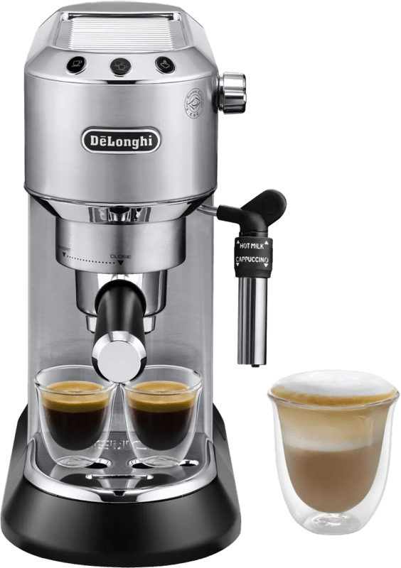 Creëer als een ware Barista de heerlijkste espresso's met het halfautomatisch pompdruk espressoapparaat Dedica Style EC 685.S/M. Dit espressoapparaat is slechts 15 centimeter breed en heeft een prachtig modern design met metalen behuizing en mooie afwerkingen in zilver. Deze zilveren Dedica Style is een ware aanwinst in jouw keuken! Het pompdruk espresso apparaat Dedica Style EC 685.S/M is voorzien van een handmatig cappuccinosysteem met regelbaar stoompijpje waarmee je de perfecte cappuccino kan creëren. De Dedica Style EC 685.S/M is zowel geschikt voor gemalen espressokoffie als voor ESE servings. Dankzij het dubbele lekbakje kan je kopjes tot 12 cm gebruiken.