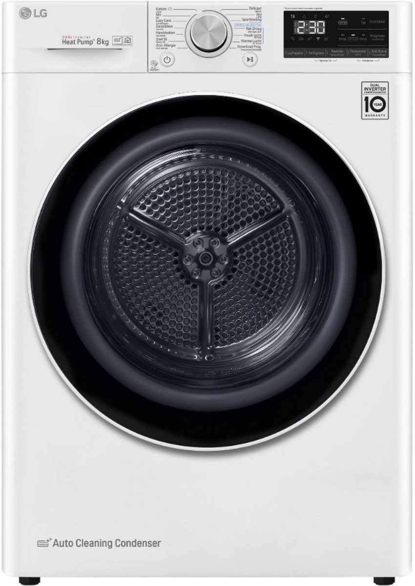 Met deze LG wasdroger droog je maar liefst 8 kg hygiënisch schoon. Dit model staat bekend om de DUAL Inverter Heat Pump™, Auto Cleaning Condensor. Deze wasdroger beschikt over Wi-Fi waardoor je hem vanaf je smartphone kunt bedienen via de ThinQ™ app. Handig om te weten: Dual Inverter Heat Pump: Tijd of energie besparen, jij bepaalt!LG drogers zijn voorzien van een DUAL Inverter Heat pump, een slimme compressor die over een Dual Droog modus functie beschikt waarmee je razendsnel droogt of minder energie verbruikt. Hierdoor bespaar je energie of tijd. Op de DUAL inverter Heat pump bieden we 10 jaar garantie, ook een duurzame keuze dus! Auto Cleaning Condensor: minder onderhoudTevens is deze droger uitgerust met een zelfreinigende condensor. Dankzij auto-cleaning wordt de condensor minimaal 3 keer per programma automatisch onder druk schoongespoeld. Hierdoor heb je zelf minder onderhoud en ben je altijd verzekerd van het beste droogresultaat! ThinQ™: Slimme apparatenDoor LG ThinQ™-technologie zijn al je LG apparaten nu nog slimmer. Met de handige ThinQ app bedien je al je LG apparaten overal. Zo kan je je was op afstand aanzetten, kijken hoelang je droogprogramma nog duurt en zelfs extra programma’s downloaden. Naarmate je de app vaker gebruikt worden de suggesties steeds beter om aan al je behoeften te voldoen en je kleding langer mooi te houden. Heb je thuis een LG wasmachine en droger, dan communiceren deze twee apparaten via de ThinQ™ app met elkaar en kiest de droger automatisch het juiste programma.