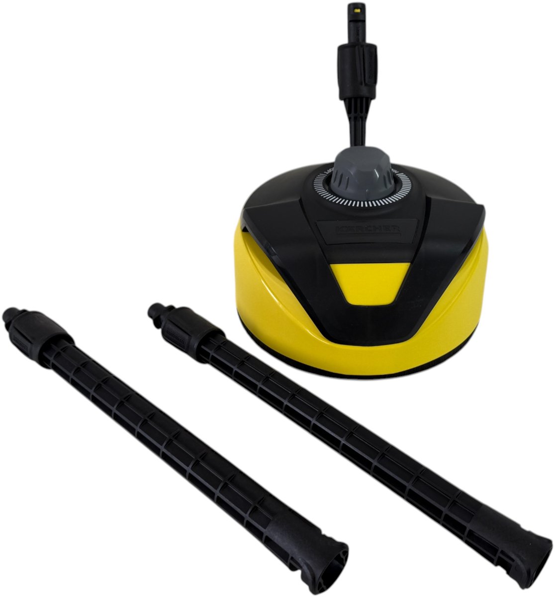 De roterende arm met twee stralen van de T-Racer T 5 oppervlaktereiniger kan vuil over grote oppervlakken verwijderen - voor snelle en efficiënte reiniging van grote buitenoppervlakken. Uiterst praktisch: de oppervlaktereiniger kan worden aangepast zodat het mondstuk op de ideale afstand van het oppervlak wordt geplaatst, afhankelijk van het materiaal. Dit betekent dat harde oppervlakken, zoals steen en beton, net zo effectief kunnen worden gereinigd als meer delicate oppervlakken, zoals hout. Als gevolg hiervan reinigt de T-Racer T 5 in ongeveer de helft van de tijd die een spuitlans nodig heeft. Bovendien beschermt de kap op betrouwbare wijze de gebruiker en de omgeving tegen spatwater en het "hovercraft-effect" maakt manoeuvreren eenvoudiger dan ooit. Zelfs verticale oppervlakken, zoals garagedeuren, kunnen efficiënt worden gereinigd dankzij de ergonomische handgreep. Geschikt voor Kärcher hogedrukreinigers van K 2 tot K 7.