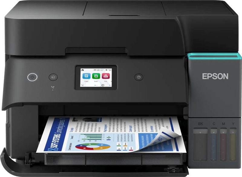 De Epson EcoTank ET-4950 is een A4-printer die beschikt over navulbare inkttanks en voordelen zoals wifi, kopiëren, scannen en faxen en is perfect voor mensen die thuis of op kantoor goedkoper willen printen. Bespaar tot wel 95% op jouw printkosten* met Epson EcoTank-printers zonder cartridges. Dankzij de speciaal ontworpen inktflessen met hoog rendement kunnen de geïntegreerde inkttanks eenvoudig worden gevuld. Zonder cartridges en met de flexibele connectiviteitsfuncties is dit de perfecte printer voor iedereen die tegen ongelofelijk lage kosten per pagina in hoge kwaliteit wil printen. Cartridges behoren tot het verleden Met EcoTank kan je probleemloos thuis en op kantoor printen. Je kan de inkttanks met hoge capaciteit gemakkelijk bijvullen zonder knoeien. De flessen hebben een sleutelvergrendeling waardoor ze alleen op de juiste kleur kunnen worden gebruikt. Dankzij de inktniveau-indicator aan de voorkant kan je gemakkelijk zien wanneer de inkttank bijgevuld moet worden. En het stijlvolle blauwe lampje op het deksel van de inkttank betekent dat je de status van jouw printer in één oogopslag kunt controleren. Blijf besparen Met deze voordelige printer bespaar je tot wel 95% op jouw printkosten* en hij wordt geleverd met tot wel 3 jaar aan inkt.* De meegeleverde inktflessen zijn goed voor maximaal 15.100 pagina's in zwart-wit en 5.500 pagina's in kleur.* Dat komt overeen met maar liefst 63 cartridges aan inkt!* Dankzij Heat-Free-printtechnologie gaat de printkop net zolang mee als de printer.* Dat betekent geen onnodige vervangingsonderdelen of upgrades en een lager stroomverbruik in vergelijking met laserprinters.* De printkop is ook ontworpen om verstopping van de nozzles te voorkomen. De printer gaat bijzonder lang mee en wordt geleverd met een standaardgarantie van 100.000 pagina's (of 1 jaar).* Boordevol functies Met een papierlade voor 250 pagina's aan de voorkant, de mogelijkheid om foto's randloos te printen (tot A4) en hoge printsnelheden tot wel 18 pagina's per minuut* kan je met gemak een groot aantal taken uitvoeren in korte tijd. Tot de extra voordelen behoren een automatische documentinvoer voor 30 pagina's, een fax, een gebruiksvriendelijk touchscreen van 6,1 cm, automatisch dubbelzijdig printen, scannen en kopiëren, en een handige uitvoerlade die automatisch wordt geopend tijdens het printen. Via een mediavenster kan je snel het papierniveau controleren. Moderne flexibiliteit Dankzij het compacte design en wifi-, wifi direct- en Ethernet-aansluiting kan je deze printer eenvoudig in jouw huidige thuissituatie integreren en gebruiken om vanaf mobiele telefoons, tablets en laptops te printen.* Dankzij ondersteuning voor dual-band en mesh wifi-netwerken is de snelheid en betrouwbaarheid van de draadloze verbinding van jouw printer geoptimaliseerd voor een snelle en naadloze printervaring.