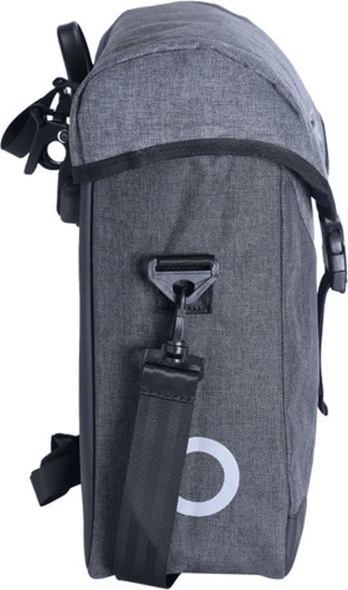 Het hoofdvak van de tas sluit u af met een aansnoerkoord en daar overheen een klep met een klikgesp. Deze ruime enkele fietstas is dankzij de afneembare (en verstelbare) schouderband ook te gebruiken als schoudertas. Handig voor wanneer u te voet verder gaat. Gebruikt u de tas even niet? Dan kunt u 'm compact opvouwen dankzij de inklapbare bodem- en zijplaten.