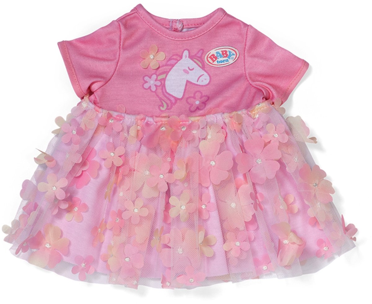 Voor poppen van 43 cm. Geschikt voor kinderen van 3+ jaar. De pop is niet inbegrepen. Lieve, roze jurk met eenhoornprint en tulen rok met bloemenmotief