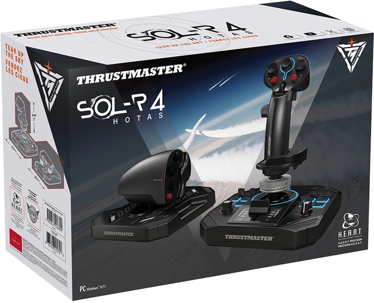 De Thrustmaster Sol-R 4 HOTAS is een geavanceerde combinatie van joystick en throttle, ontworpen voor intensieve vluchtsimulaties op pc. Met een modulair ontwerp geschikt voor zowel links- als rechtshandigen, biedt deze setup een ongeëvenaarde precisie dankzij H.E.A.R.T. (HallEffect AccuRate Technology) magnetische sensoren. De joystick beschikt over 44 knoppen en 8 assen, terwijl de throttle 14 knoppen en 5 assen biedt, inclu... lees meer over dit product