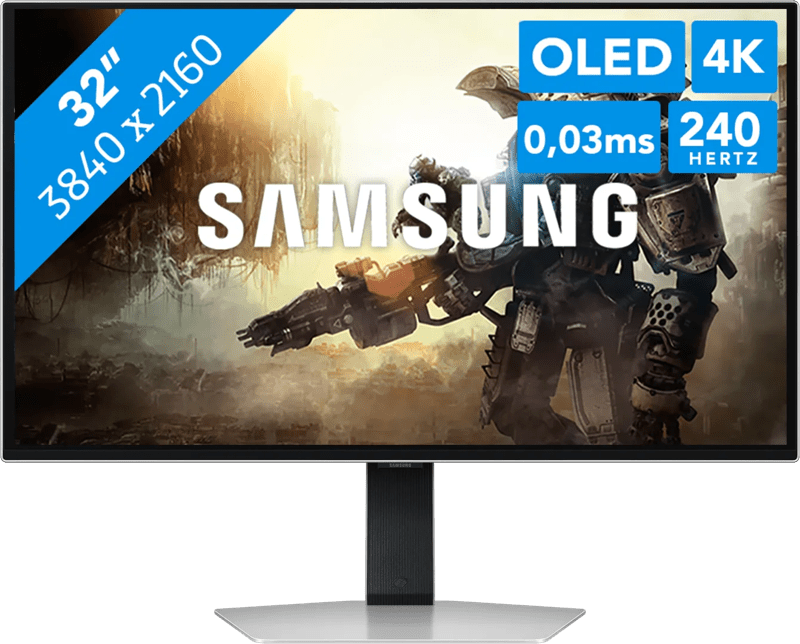 De Samsung 32" Odyssey OLED G8 G81SF UHD 240 Hz gaming monitor is een prachtig scherm, voor een schitterende game-ervaring. Er gaat een nieuwe wereld voor je open met een haarscherpe beeldkwaliteit. Dit QD-OLED-scherm biedt een haarscherpe 4K-beeldkwaliteit op een 27” display met een toonaangevende pixeldichtheid van 166 PPI. Geen enkel detail ontgaat je meer in je favoriete games! Glare Free Ongestoord gamen? Dankzij de Glare Free-technologie is je scherm 54% minder glanzend dan standaard antireflectielagen. Hierdoor heb je geen last van de weerkaatsingen van externe lichtbronnen. Zo ontsnapt geen enkele vijand meer aan je aandacht, zelfs niet als de zon op je scherm staat. VESA DisplayHDR TrueBlack 400 Ontdek verborgen elementen in je favoriete games. Met VESA DisplayHDR TrueBlack 400 worden je zwarttinten kleurecht weergegeven zonder lichtverlies en met meer contrast en kleurdiepte. Scènes worden levendiger en dit geeft de achtergrond meer diepte en scherpte. Dynamic Cooling System Dit is 's werelds allereerste monitor met een Pulsating Heat Pipe. Deze geeft een koelvloeistof af waardoor warmte 5 keer zo snel wordt verspreid als met een grafietplaat. Dit zorgt voor een lagere kerntemperatuur en voorkomt inbranding. Thermal Modulation System Het Thermal Modulation System gebruikt algoritmen om de helderheid automatisch te bedienen en oververhitting te voorkomen. Detectie van logo en taakbalk De helderheid van statische afbeeldingen, zoals logo's en taakbalken wordt automatisch gereduceerd om inbranding te voorkomen. Screensaver Het scherm wordt automatisch gedimd na 10 minuten inactiviteit en keert terug naar normale helderheid als er op een toets wordt gedrukt of als de muis wordt bewogen. 240 Hz refresh rate & 0,03 ms responstijd Til je actiegames naar een hoger niveau. Dankzij een refresh rate van 240 Hz en een responstijd van 0,03 ms GTG profiteer je van een soepele game-ervaring en haarscherpe visuals. Laat je meeslepen door de actie, zonder onderbrekingen Het scherm kan je actiegames moeiteloos bijbenen dankzij de variable refresh rate (VRR) en AMD FreeSync Premium Pro. Dankzij de gesynchroniseerde GPU en paneel heb je minder last van haperingen, vertragingen en tearing. Zo pak je zelfs de overwinning in de moeilijkste game. Slank metalen ontwerp Upgrade je gamestation met een strak design. Deze monitor is gemaakt van echt metaal en is voorzien van een luxe afwerking. Hij misstaat dus niet in jouw interieur. Ontspannen en toch winnen? Het kan! Kantel je monitor en stel de weergave zo in dat je al je tegenstanders perfect in beeld krijgt. CoreSync & CoreLighting+ Zet de toon voor het gamen. CoreSync-technologie geeft de kleuren van je game weer met 16,7 miljoen kleuren. Dankzij CoreLighting+ wordt je game in levendige kleuren weergegeven.