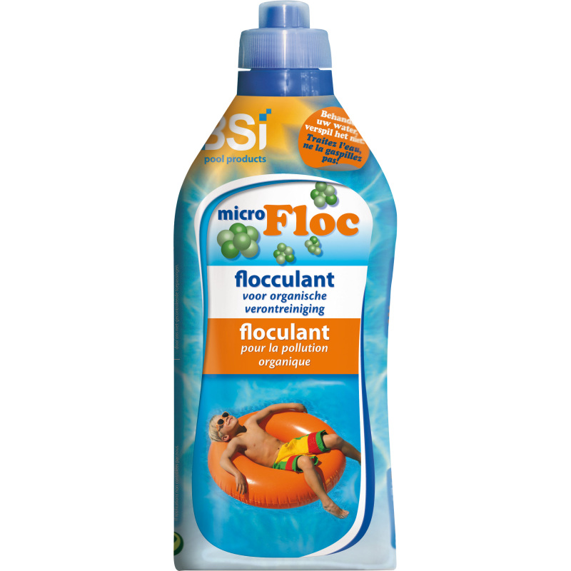 BSI Micro Floc helpt je om alle fijne, niet filterbare verontreinigingen te doen samenvlokken. De fijnste vuile deeltjes zijn vaak moeilijk weg te filteren, met dit vlokmiddel klitten zelfs de kleinste deeltjes aan elkaar tot ze vlokken vormen. Voeg de vloeibare Micro Floc toe aan de ingang van de skimmer en laat dit gedurende 10 à 12 uren circuleren. Er kan zich een waas vormen op de zwembad-wanden, leg dan de circulatiepomp stil. De fijnste vlokken zakken 's nachts naar de bodem van het zwembad. Die kan je 's morgens opzuigen met een bodemzuiger of via de functie "DRAIN" of "WASTE" verwijderen via de filter. Hou bij een zandfilter de drukmeter goed in het oog, bij te veel druk is de filter vuil.