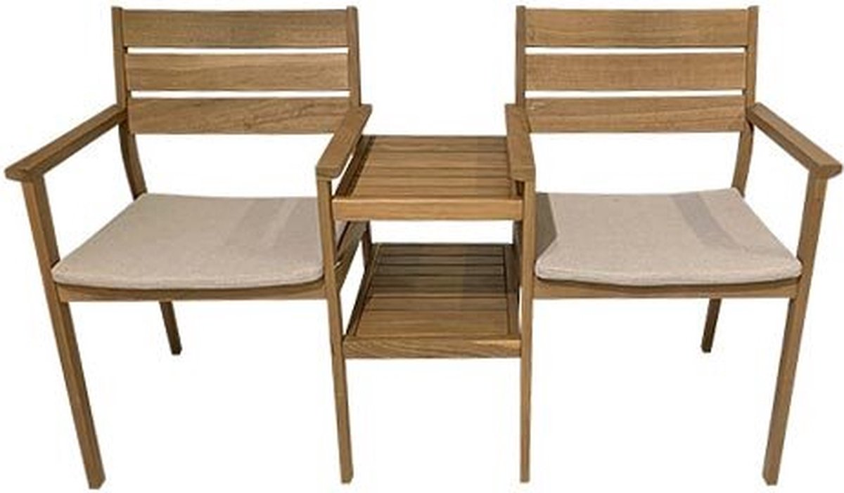 Gezellig samen genieten van de zon met een heerlijk koud drankje erbij! In de Cruz Tete a Tete tuinbank van Buitengewoon Boet zit je deze zomer wel goed! De Cruz tuinbank is een set bestaande uit 2 stoelen, gekoppeld door een bijzettafeltje in het midden. Handig om bijvoorbeeld je drankje op te bewaren.De Cruz Tete a Tete tuinbank is gemaakt van acaciahout en wordt geleverd inclusief zitkussens.ProductvoordelenOnderhoudsvriend... lees meer over dit product