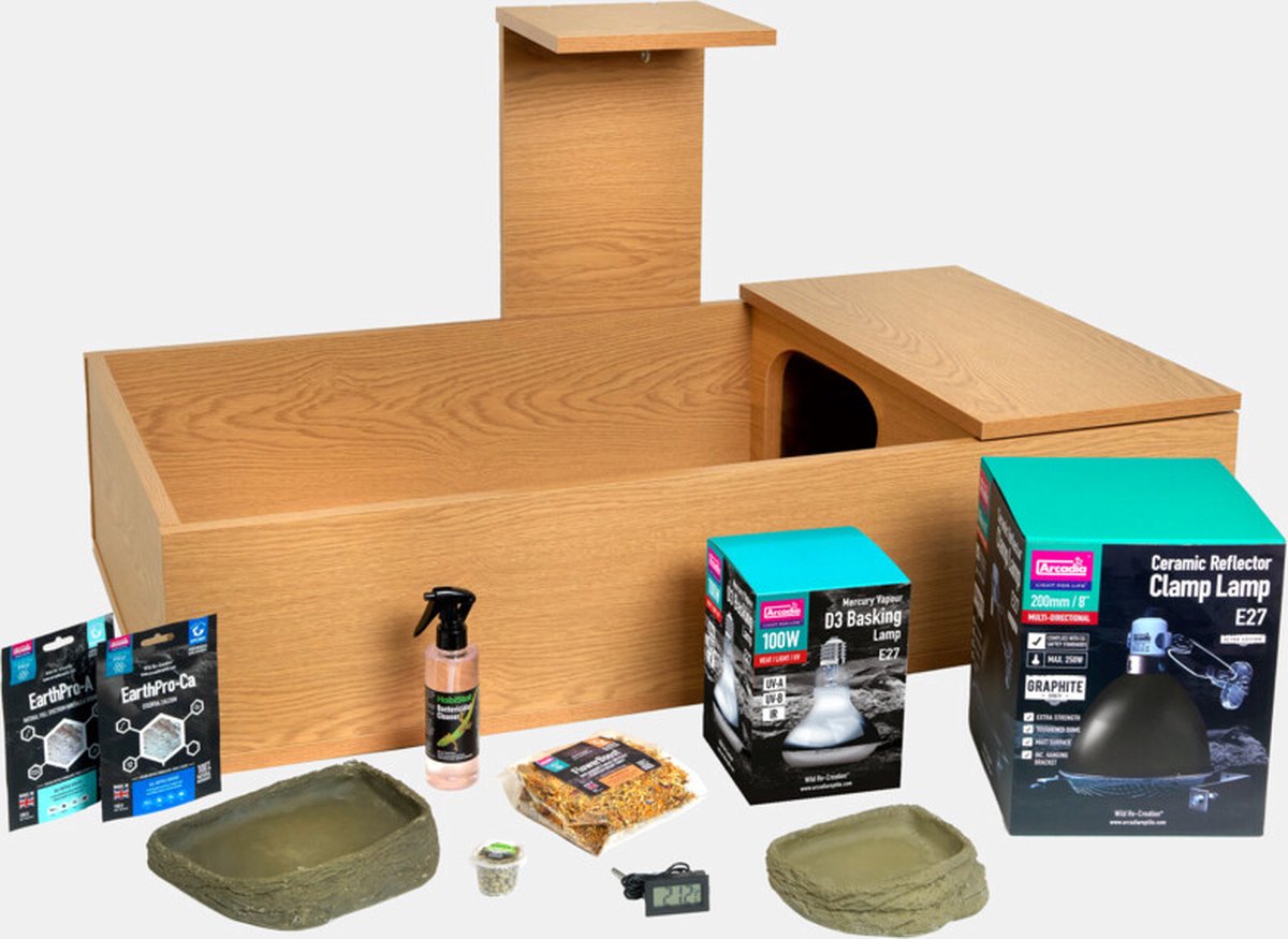 De HabiStat Tortoise Table Accessory Kit bevat alles wat nodig is om uw opstelling voor een landschilpadden verblijf te voltooien inclusief UV verlichting, verwarming en accessoires. Als uw verblijf is neergezet en de bodembedekking is geplaatst, hoeft u alleen de HabiStat Tortoise Table Accessoire Kit te installeren en uw verblijf is klaar voor uw landschildpad. Inhoud: - Arcadia Reflector Klemlamp met Keramische Houder - Arcadia 2e generatie UV-Basking lamp met UVB, 100W - Digitale compacte thermometer - HabiStat Schildpad waterbak x 2 - Arcadia Earth Pro-A - Arcadia Earth Pro Ca - Arcadia Earth Pro FlowerBoost - HabiStat bacteriedodende reiniger Voor enkele top tips over het opzetten, bekijk dan zeker onze opstellingsvideo.