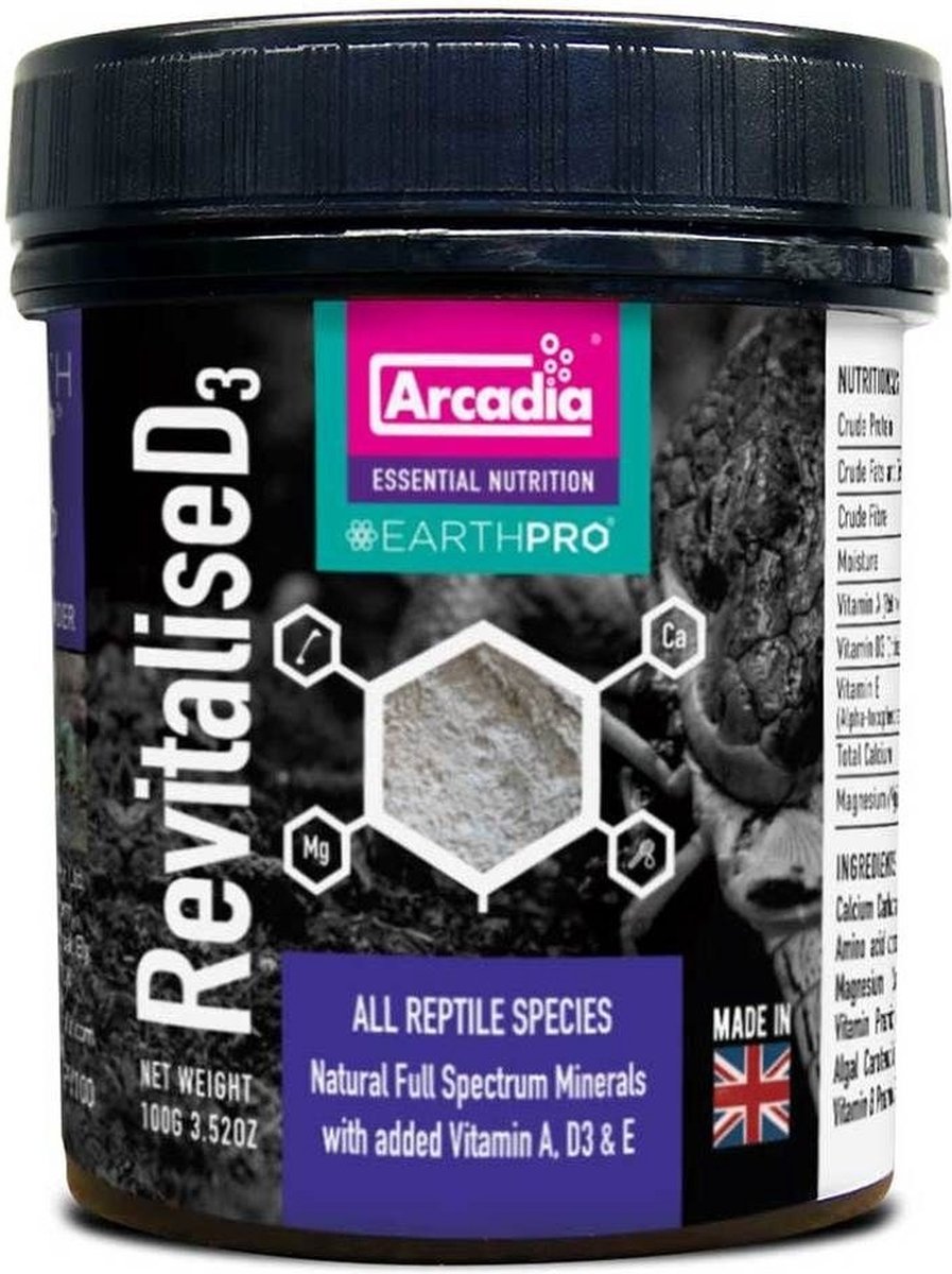Arcadia EarthPro RevitaliseD3 is het resultaat van jarenlang rigoureus onderzoek en ontwikkeling en levert op een nieuwe en zeer effectieve manier essentiële mineralen en vitamines aan in gevangenschap gehouden dieren. Door samen te werken met gespecialiseerde dierenartsen, dierentuinen en reptielverzorgers over de hele wereld hebben we een gloednieuw ultrafijn poeder ontwikkeld. Dit kan worden gebruikt om de niveaus van voorgevormde vitamines A, D3 en E bij te vullen. Arcadia EarthPro RevitaliseD3 biedt de allerbeste balans van natuurlijke (aard)mineralen, aminozuren, full-spectrum carotenoïden, B-vitamines en bijenpollen, net zoals je zou verwachten van een Arcadia EarthPro product.