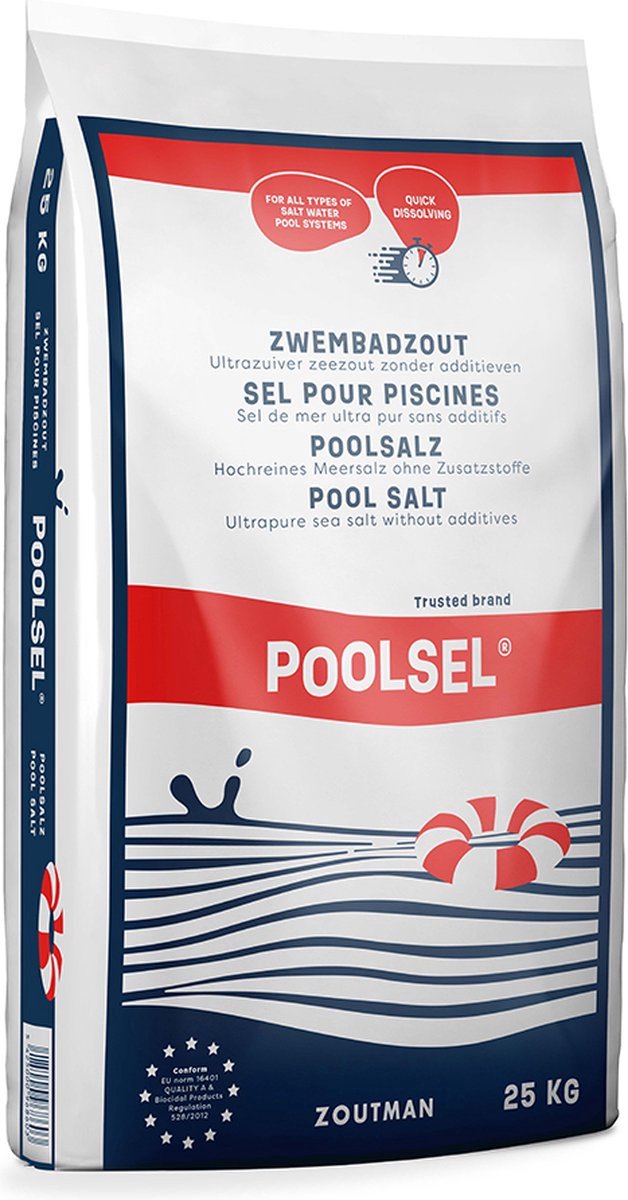 Zwembadzout - Poolsel - 25 kg Dit zwembadzout is geproduceerd op basis van natuurlijk grof zeezout met hoge zuiverheid en laag sulfaatgehalte. Dat maakt het uitermate geschikt voor gebruik in zwembaden. Het voordeel van het gebruik van zout in een zwembad, is dat u vaak maar 1 keer extra zout dient toe te voegen aan het zwembad, om een eventueel tekort aan te vullen. De inhoud van een zak zwembadzout is 25 kg. Toepassing Zout... lees meer over dit product