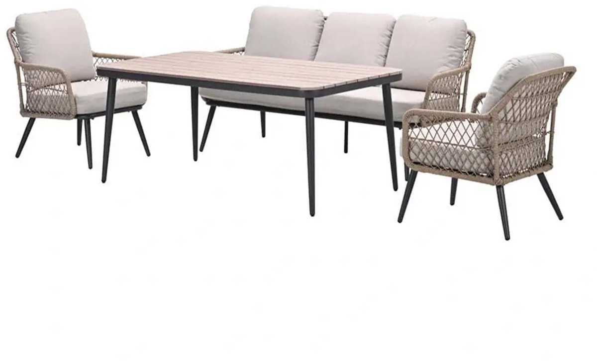 Deze lounge-diningset bestaat uit vier delen: een driezitsbank, twee fauteuils en een medium hoge tafel. Je kunt de set op verschillende manieren opstellen. Zet bijvoorbeeld de fauteuils en de driezitsbank tegenover elkaar om ruimte te besparen, of plaats de fauteuils aan de beide kopse kanten van de tafel.