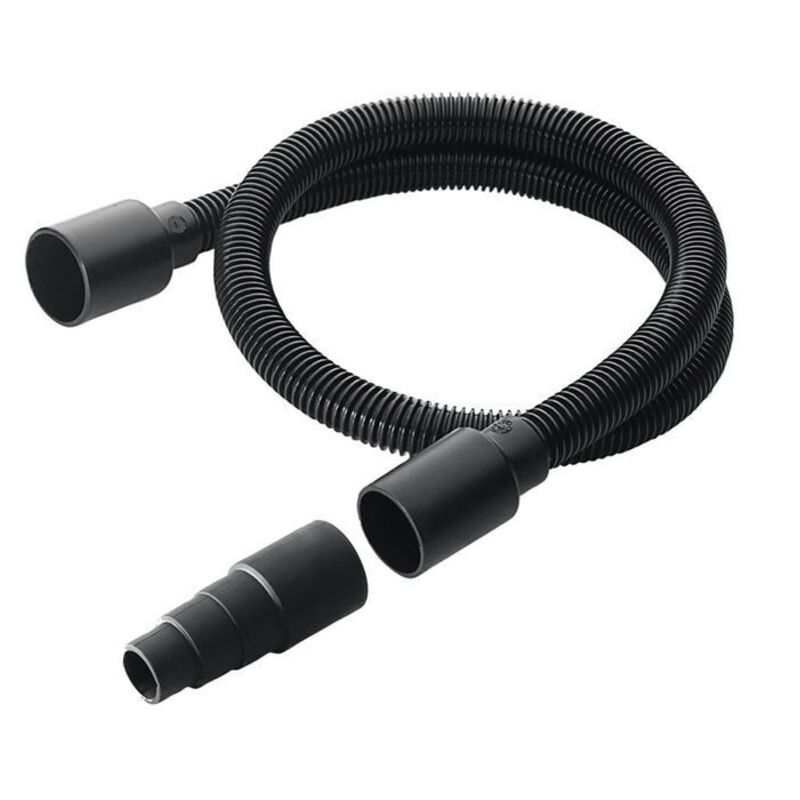 Flexibele zuigslang (1 m) met adapter voor het aansluiten van de slang aan de afvoerlucht van elektrisch gereedschap, bv. zaag-, slijp-, boormachine, schaaf, enz. Het geproduceerde stof wordt onmiddellijk opgezogen en vervuilt de kamer of de lucht niet.