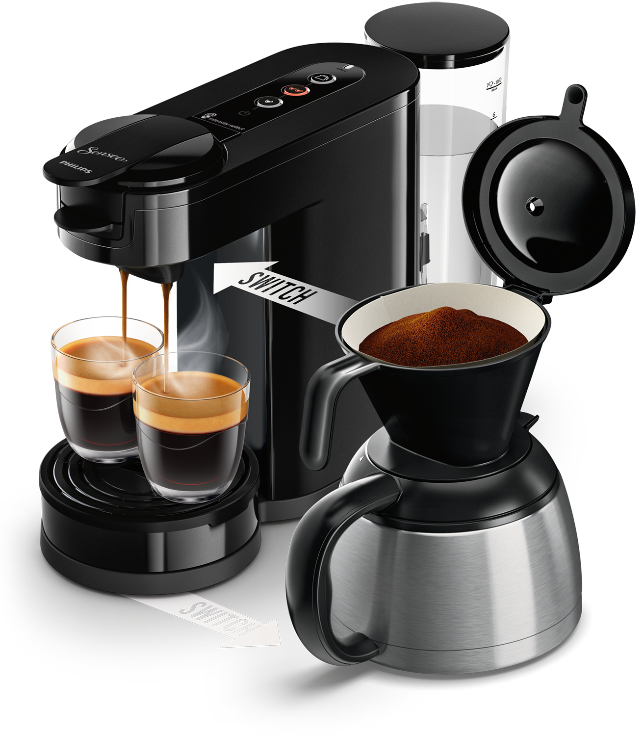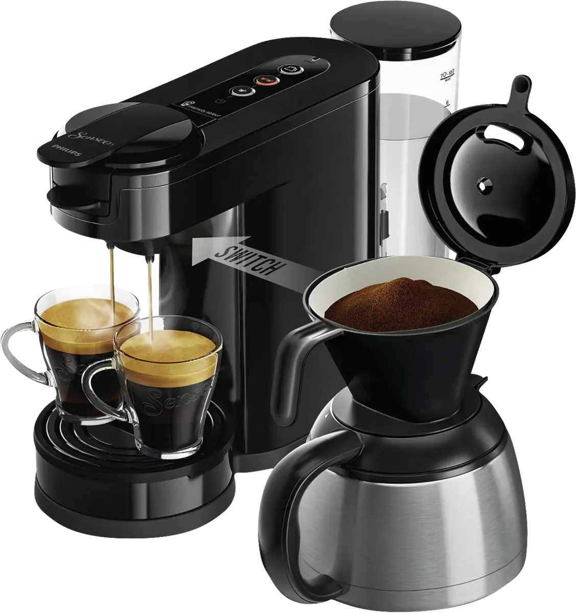 Sterke eigenschappen van Philips Senseo Switch koffiemachine PAD- EN FILTERKOFFIEZETAPPARAAT: Geniet van veelzijdigheid met pads of gemalen koffie. INCL THERMISCHE KAN: Houd jouw koffie langer warm met de thermische kan. 2 KOPJES KOFFIE PER KEER: Zet snel 1 of 2 kopjes koffie in minder dan 1 minuut. INSTELBARE INTENSITEIT: Kies tussen een sterke espresso of een zachte koffie. HEERLIJK CRÈMELAAGJE: Perfecte koffie met een romi... lees meer over dit product