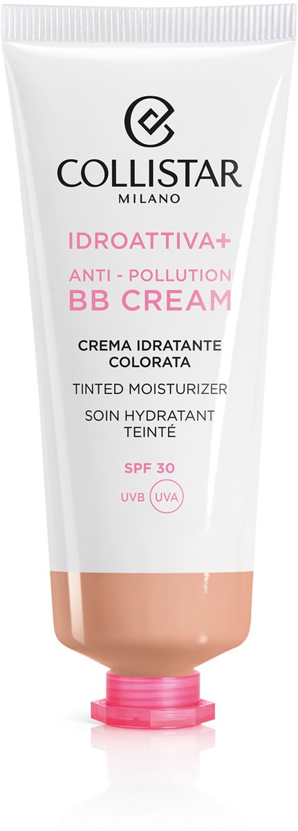 Collistar IDROATTIVA+ Anti-Pollution BB CreamGekleurde hydraterende crème met een onzichtbare textuur die dankzij donkere pigmenten voor een perfecte, heldere en egale teint zorgt. De crème bestrijdt het vochtverlies en houdt het van nature in de onderhuid aanwezige water vast, dankzij de technologische en botanische kern, bestaande uit: * IDROATTIVA+ COMPLEX: voor hydratatie en bescherming. Het speciale hydraterende actieve bestanddeel op basis van suikers met inuline hydrateert intens tot 100 uur lang. Het garandeert bovendien maximale interne en externe bescherming dankzij een biomimetisch actief bestanddeel dat de structuur van de huidbarrière simuleert. * GEHYPERFERMENTEERDE ITALIAANSE PIOENROOS: vandaag tweemaal zo doeltreffend met een zuiverende, antioxiderende en ontgiftende werking.De huid is de hele dag lang beschermd dankzij de formule op basis van zonnefilters met SPF 30 UVB die ook tegen UV A-stralen, IR-stralen en blauw licht beschermen. De huid ziet er natuurlijk stralend en helder uit, is gehydrateerd en wordt beschermd tegen externe invloeden met als resultaat een steeds egalere teint. * 100 uren hydratatie * Onzichtbare textuur * SPF 30 * 100% vegan formule * 0% siliconen * Ideaal voor alle huidtypen, ook de gevoelige huid