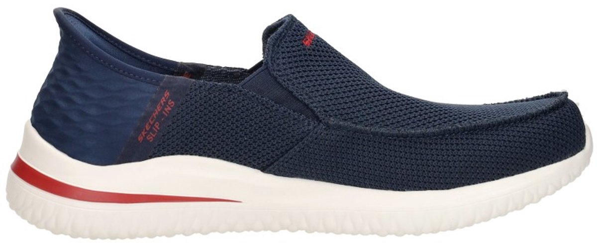 Voordelen Skechers Slip-Ins Delson 3.0 Cabrino voor herenDe blauwe heren instappers van Skechers zijn ontworpen met het oog op gemak en comfort. De Delson 3.0 Cabrino, uitgevoerd in een diepe blauwe kleur, zijn de ideale schoenen voor elke dag. Je stapt er gemakkelijk in en uit, zonder gedoe met veters, en ze voelen direct prettig aan je voeten. De zachte textiel voering en het flexibele bovenwerk zorgen voor een fijne pasvorm die zich aanpast aan de voet, wat bijdraagt aan een rustige drukverdeling tijdens het lopen en staan.