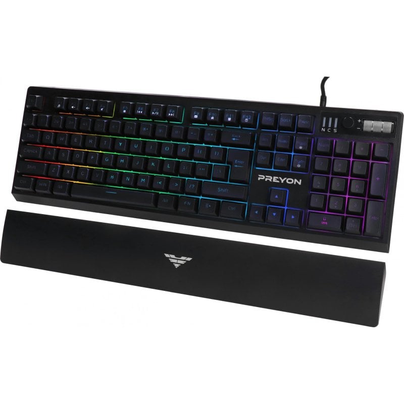PREYON PLCA104B. Toetsenbord formaat: Volledige grootte (100%). Stijl toetsenbord: Recht. Connectiviteitstechnologie: Bedraad, Aansluiting: USB, Toetsenbord toetsschakelaar: Membraan keyswitch, Toetsenbordindeling: QWERTY, Aantal toetsen, toetsenbord: 104. Backlight type: RGB LED. Aanbevolen gebruik: Universeel. Kleur van het product: Zwart