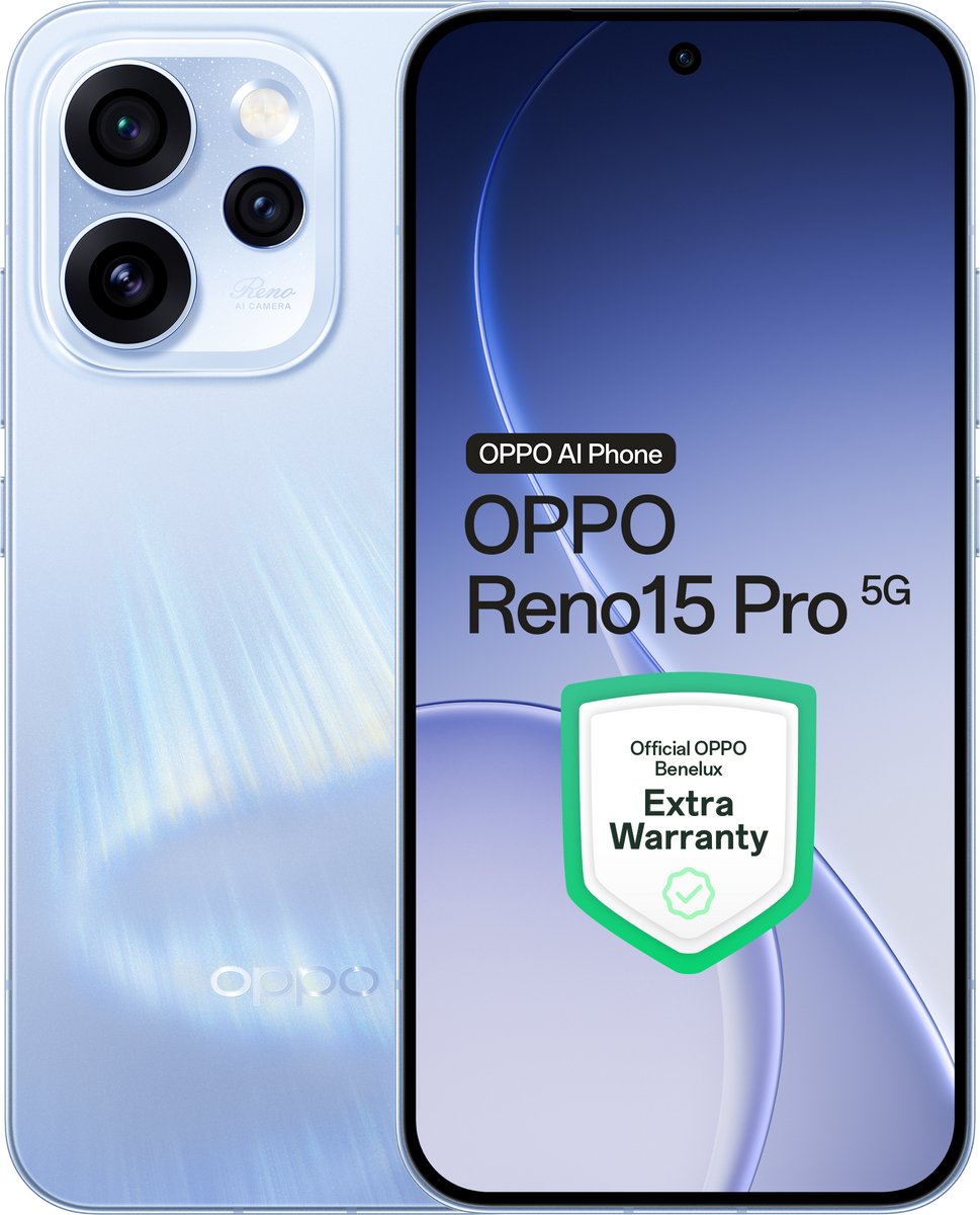 OPPO Reno15 Pro 5G 12+512GB Aurora Blue - Extra Warranty Professionele camera. Krachtige prestaties. Elegant design. De OPPO Reno15 Pro 5G is gemaakt voor mensen die méér willen vastleggen, delen en beleven. Met zijn verfijnde ontwerp, geavanceerde camera’s en langdurige prestaties is dit jouw dagelijkse partner — van creatieve content tot soepel multitasken. Slank design. Energie voor de hele dag. De Reno15 Pro ligt licht en ... lees meer over dit product