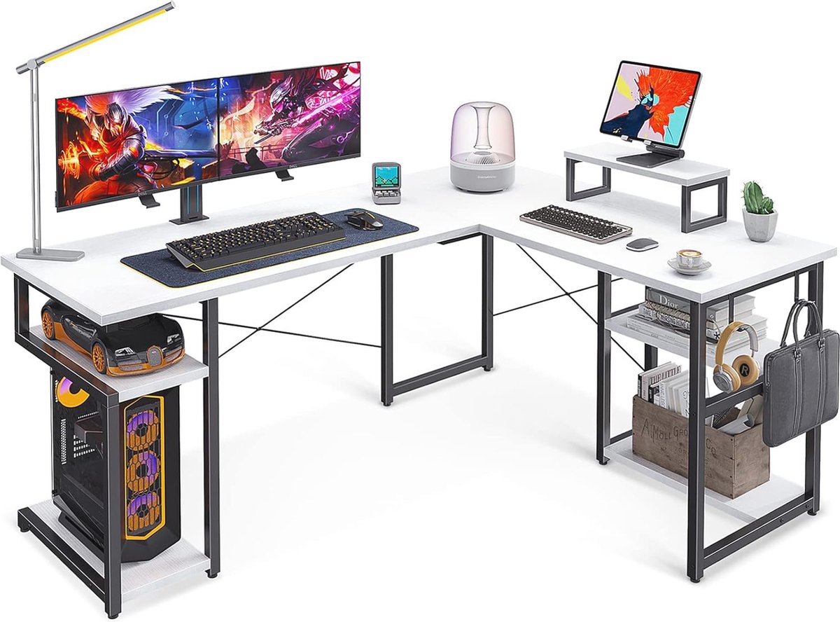 L-vormig bureau met opbergruimte en haken - Hoekbureau voor thuis en kantoor (Wit, 148×120 cm)