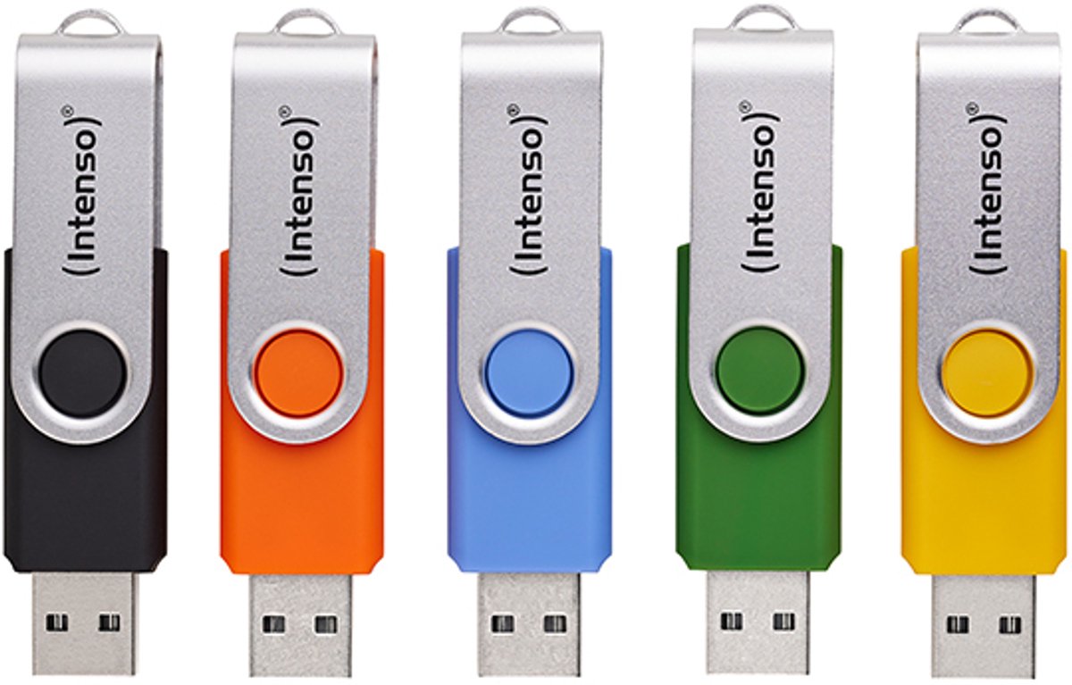 Intenso USB-stick 64 GB 3543595 De OFFICE LINE Multipacks van Intenso bieden de ideale oplossing voor iedereen die grote hoeveelheden gegevens betrouwbaar wil opslaan, vervoeren en organiseren. Met vijf USB-sticks in de kleuren geel, groen, zwart, blauw en oranje is een overzichtelijke organisatie van uw bestanden kinderlijk eenvoudig. De zilverkleurige metalen beugel zorgt voor stabiliteit en maakt een eenvoudige bevestiging... lees meer over dit product