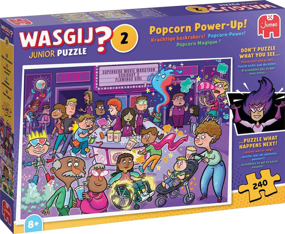 Wasgij Junior - Krachtige kaskrakers! Er is een ultiem filmfestijn over superhelden in de bioscoop. Iedereen staat in de rij voor popcorn, snoepjes en slush puppy. Maar ineens gebeuren er vreemde dingen bij de kassa ... Schoenen beginnen te smelten, vonken vliegen door de lucht en iemand begint te zweven! Zou het maar verbeelding zijn of gaan de bezoekers iets te veel op in de films? Gebruik je fantasie en puzzel wat er hiern... lees meer over dit product