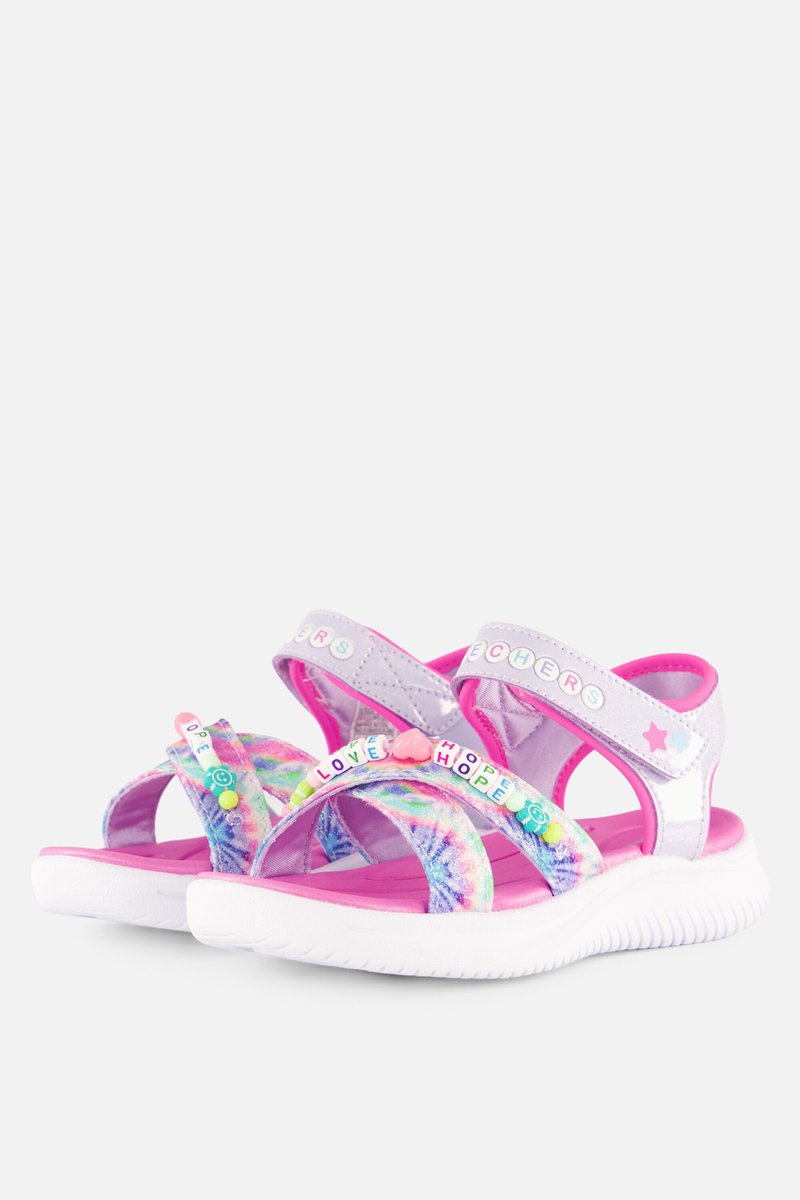 Lila Skechers Jumpsters sandalen voor meisjes. Gemaakt van textiel, een binnenwerk van textiel en een rubberen zool. De sandalen hebben een wreefbandje met klittenband en cross-over banden over de tenen. Het voetbed is comfortabel en gemaakt van synthetisch materiaal. Voorzien van tie dye print en kraaltjes op de teenband en een flexibele zool. lees meer over dit product