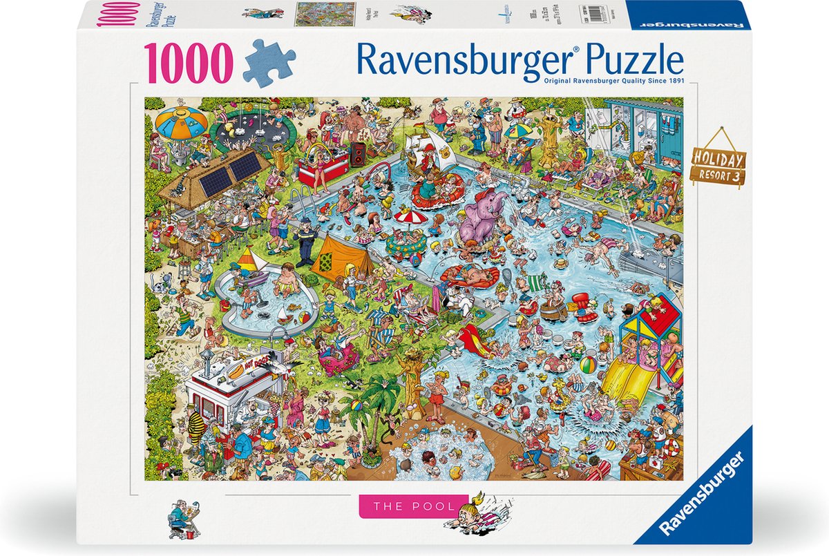 Ravensburger – Holiday Resort 3: The Pool – Cartoon Legpuzzel – 1000 Stukjes De Ravensburger Holiday Resort 3: The Pool is een kleurrijke en humorvolle cartoon legpuzzel uit Ray’s Comic Series, geïllustreerd door Ray Nicholson. Deze puzzel laat een levendig vakantiepark zien waar bij het zwembad van alles tegelijk gebeurt. Van ontspannen vakantiegangers tot chaotische en grappige situaties: hoe langer je kijkt, hoe meer detail... lees meer over dit product