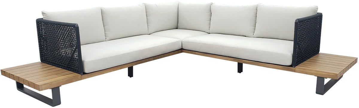 TENERIFE LOUNGE CORNER SET PROMO 2 PCS ( LEFT BENCH, RIGHT BENCH )(1263) / ALU ANTHRACITE / ROPE ROUND 4,5MM ANTHRACITE / ACACIA LIGHT TEAK LOOK / SEAT CUSHION: STANDARD + BACK CUSHION: STANDARD ROYAL SAND 240 material_type ROUND 4,5MM frame_material ALU frame_material_color ANTHRACITE cushion_color ROYAL SAND 240 material_color ANTHRACITE lees meer over dit product