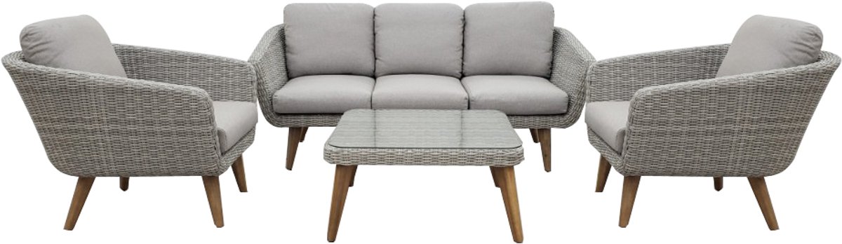 MIRE LOUNGE SET (12053) / ALU LIGHT GREY / WICKER HALFROUND 7MM NATURAL WHITE GREY / WOOD ACACIA LIGHT TEAK LOOK. / FSC 100% / SEAT CUSHION: STANDARD + BACK CUSHION: STANDARD ROYAL STONE GREY 240 material_type HALFROUND 7MM frame_material ALU frame_material_color LIGHT GREY cushion_color ROYAL STONE GREY 240 material_color NATURAL WHITE GREY lees meer over dit product